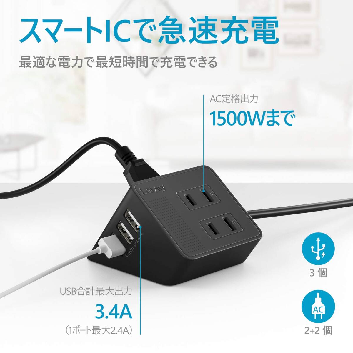 【1台7役】このたこあしコンセントは4つAC差込口と3つUSBポートの組み合わせ、コンセント不足を解消!電源タップは各USBポート最大2.4A急速充電可能で、合計3.4A出力できます。本コンセントタップはUSBポートがスマートIC搭載だから、接続機器を自動検知し、最適な電流で充電を行います。
