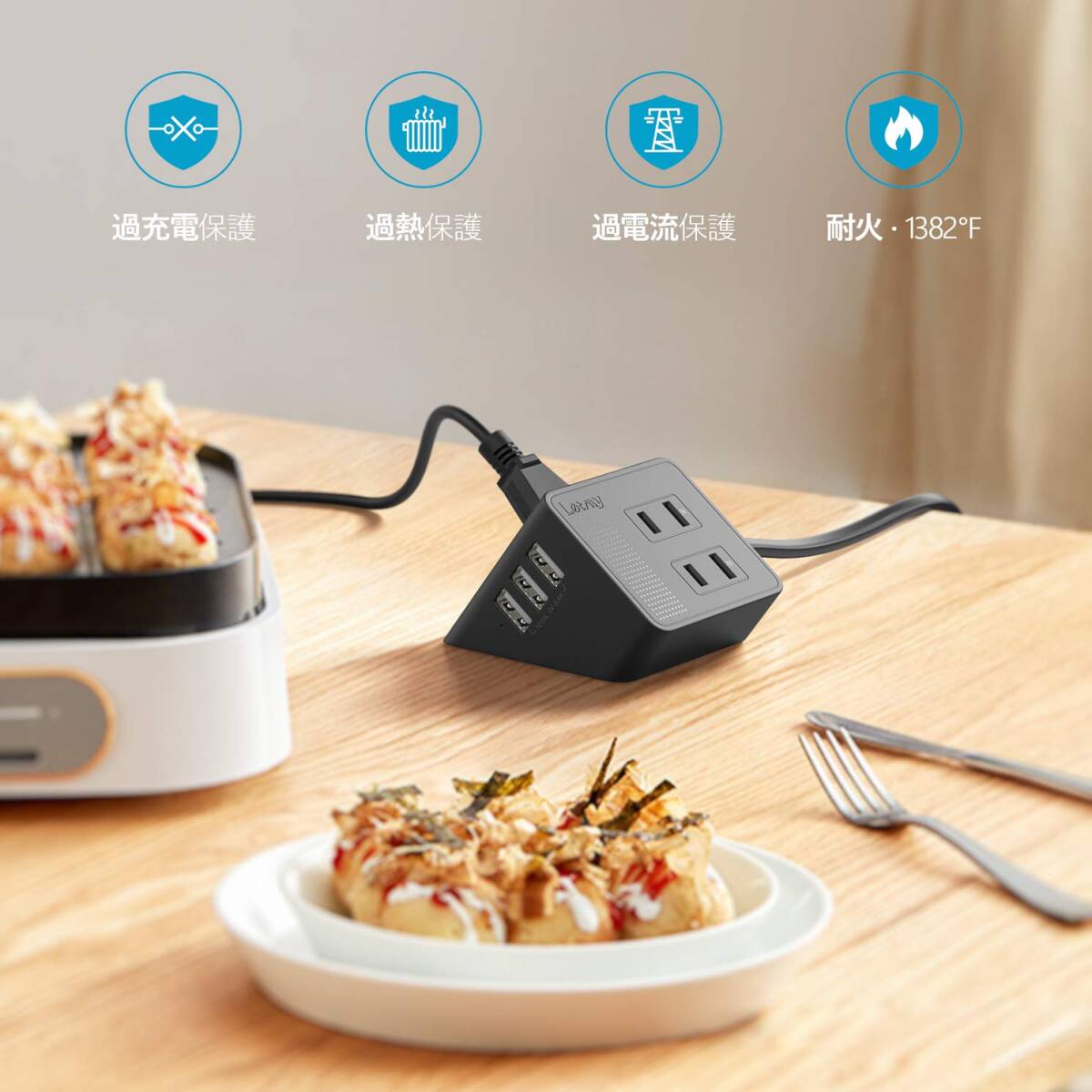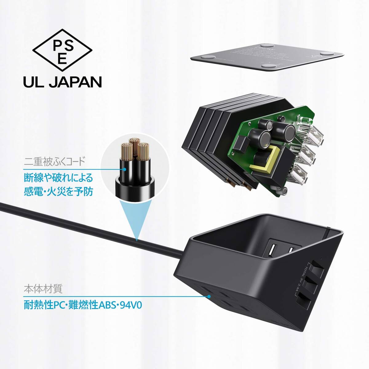 【多重安全保護】この電源タップ usbは通電ランプを内蔵しているので消し忘れを防止できます。過熱、過電流、過負荷、過充電からお使いの家電を守り、安全で頼りになれるテーブルタップです。電源コードは耐熱性に優れた樹脂二重被ふくコードを採用していますので、長期間安心してお使いいただけます。