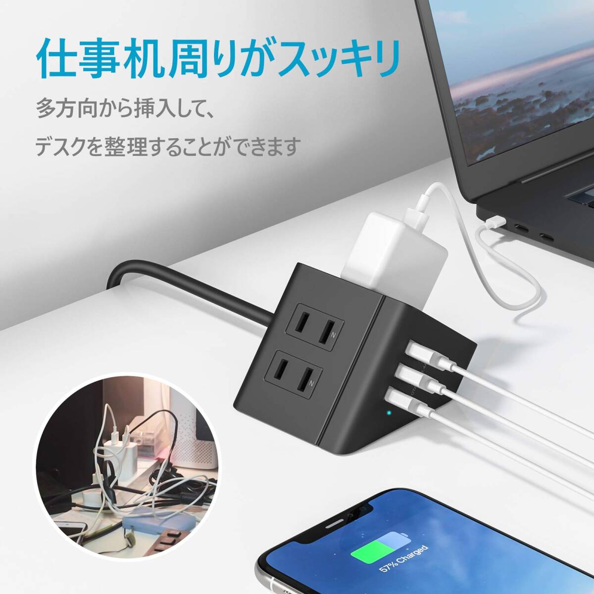 【安定性ある三角形構造】延長コードのUSBとACタップは各方向に分配して、コンセント同士の干渉を防ぎ、すっきりとした配線を実現できます。タップの底面に滑り止め用のゴムがより安定を提供します。テーブルタップのAC口の出力は最大1500Wで、家庭、オフィス、会議室、パーティーなどにも大活用できます。