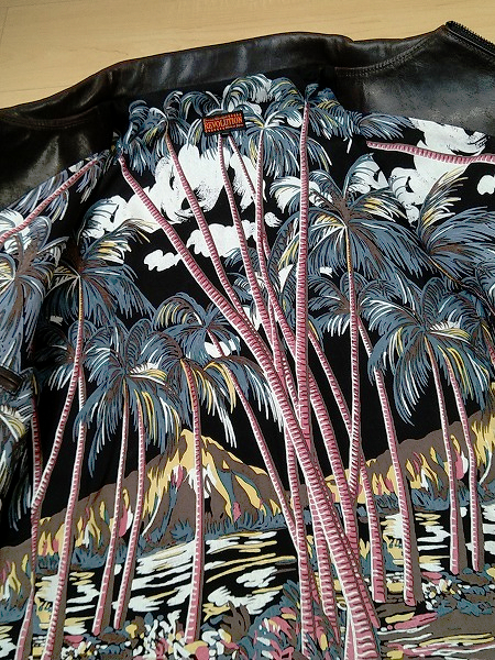 REVOLUTIONがフラットヘッドに別注を掛けたライダースで、インナーはフラットヘッドのアロハをふんだんに使い凝りまくったライダース。