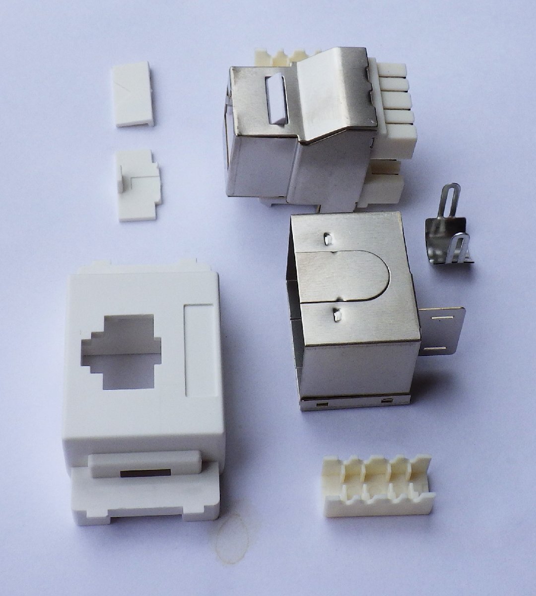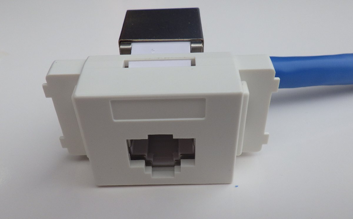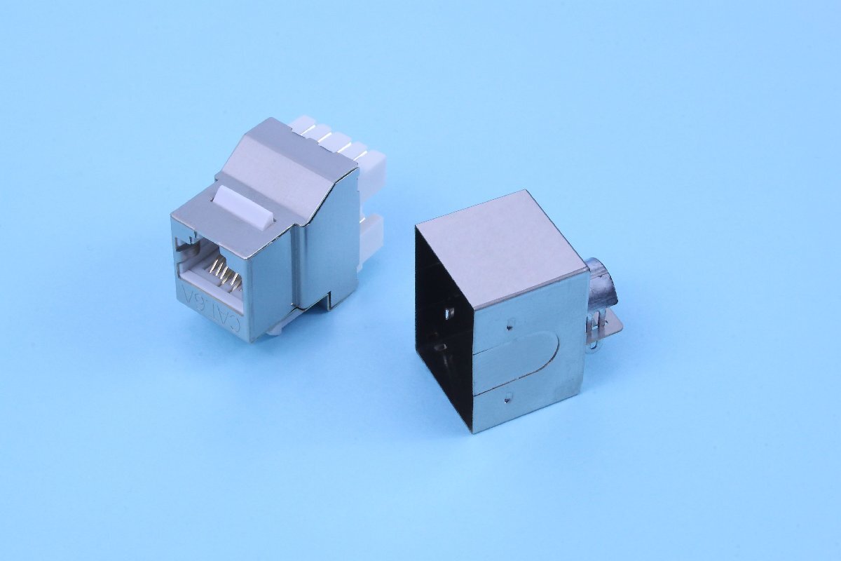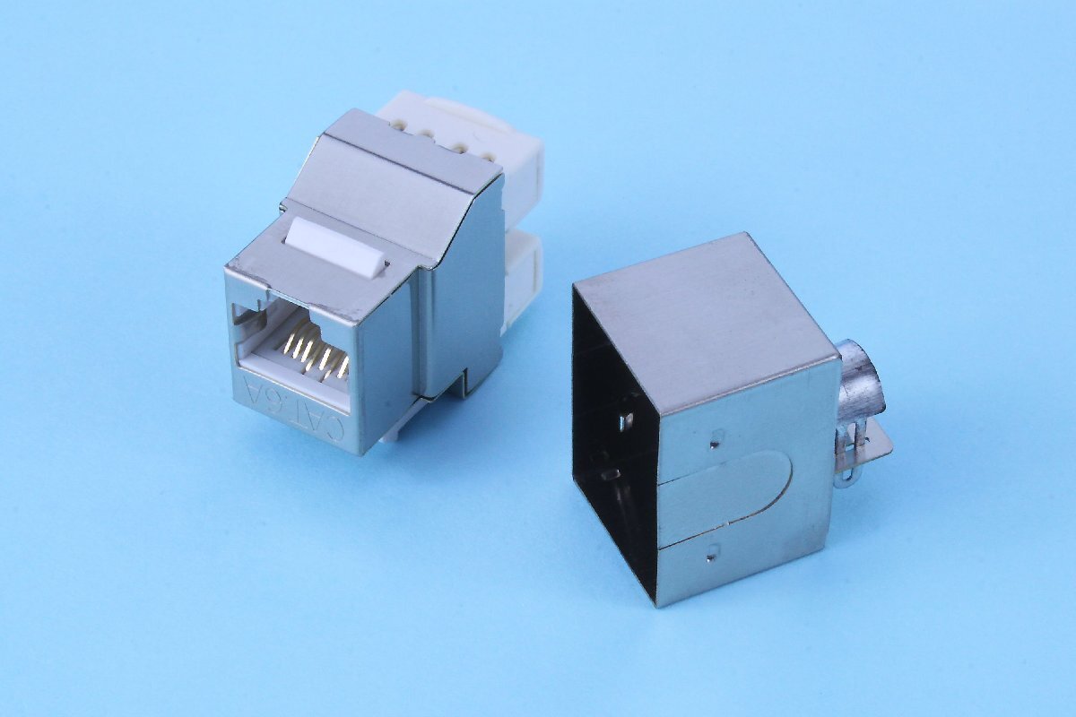 | Cat.6A 180度 FTP埋込メタルシールド モジュラー ジャック、IDC: クローネ、キャップ付き3方行ケーブル出し | |
