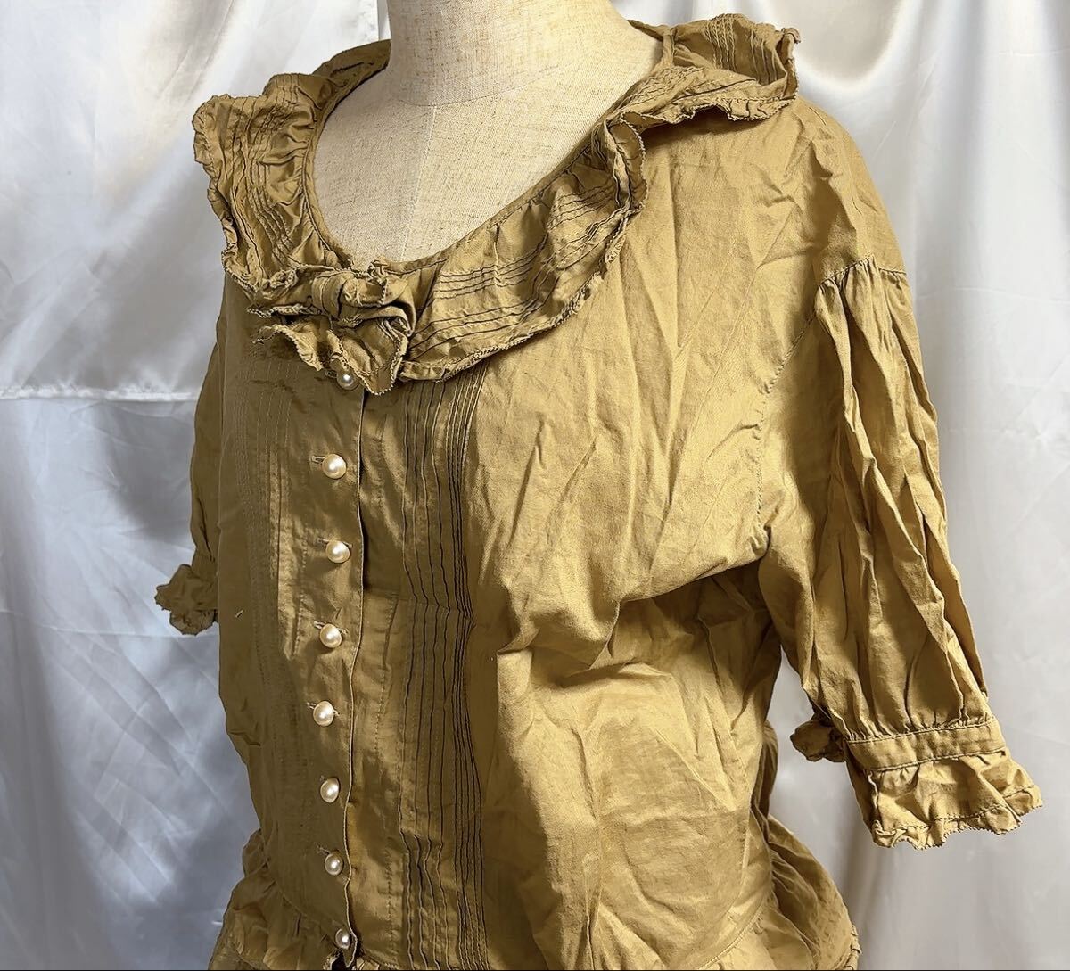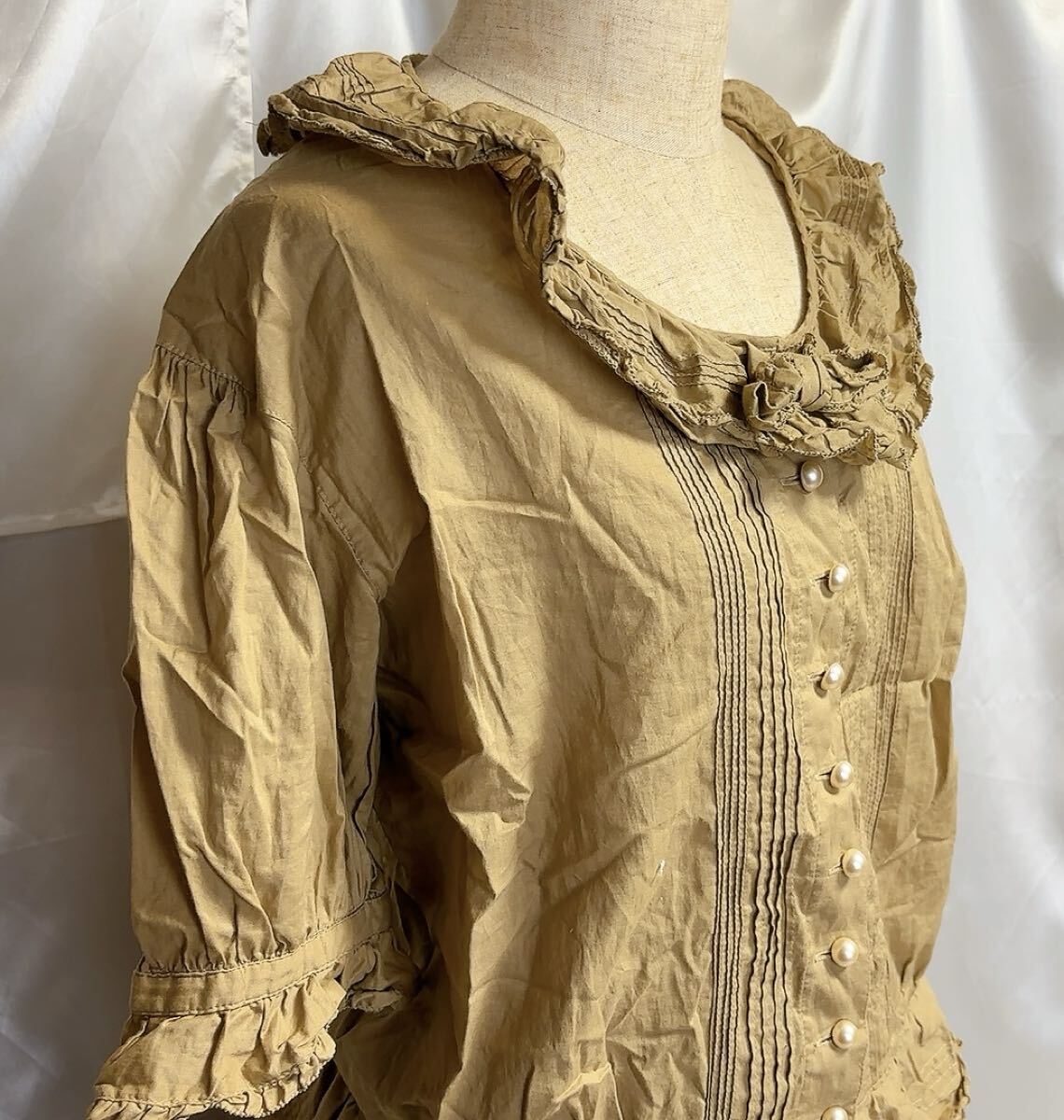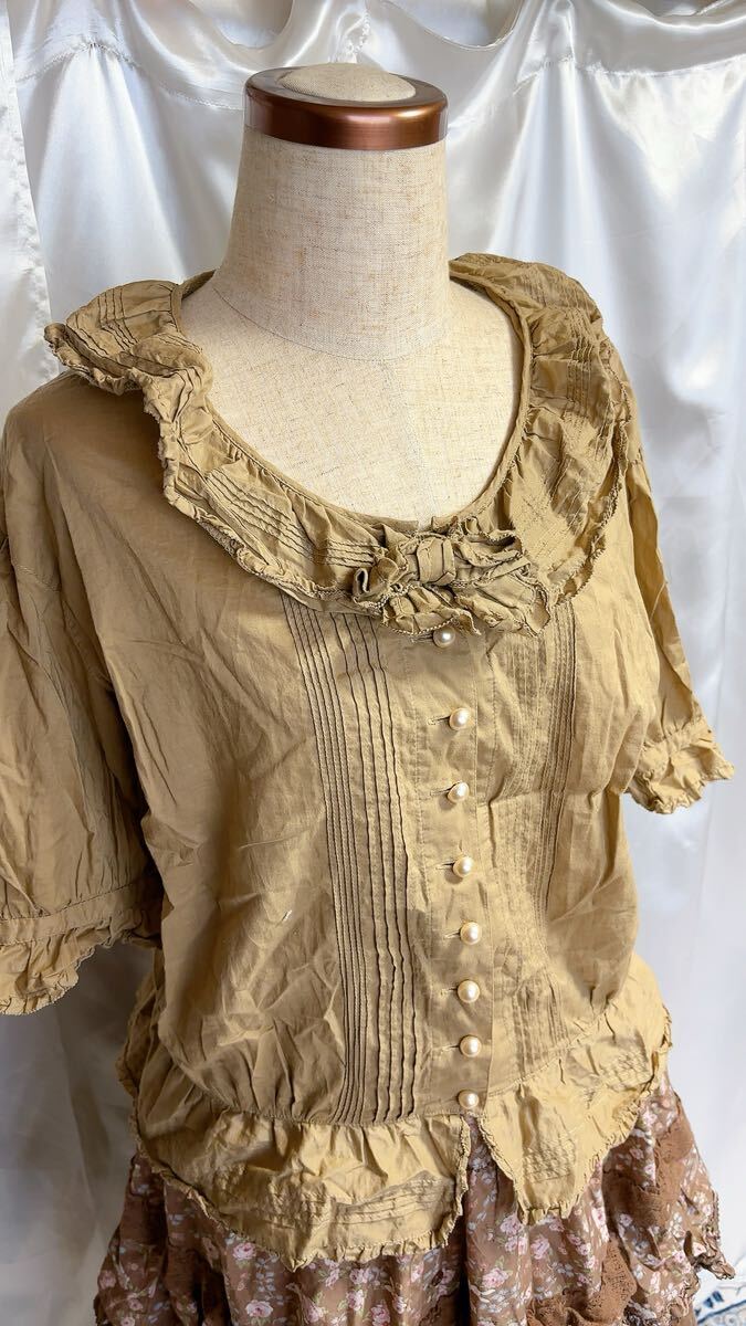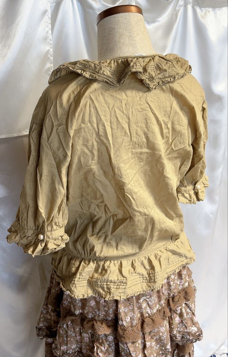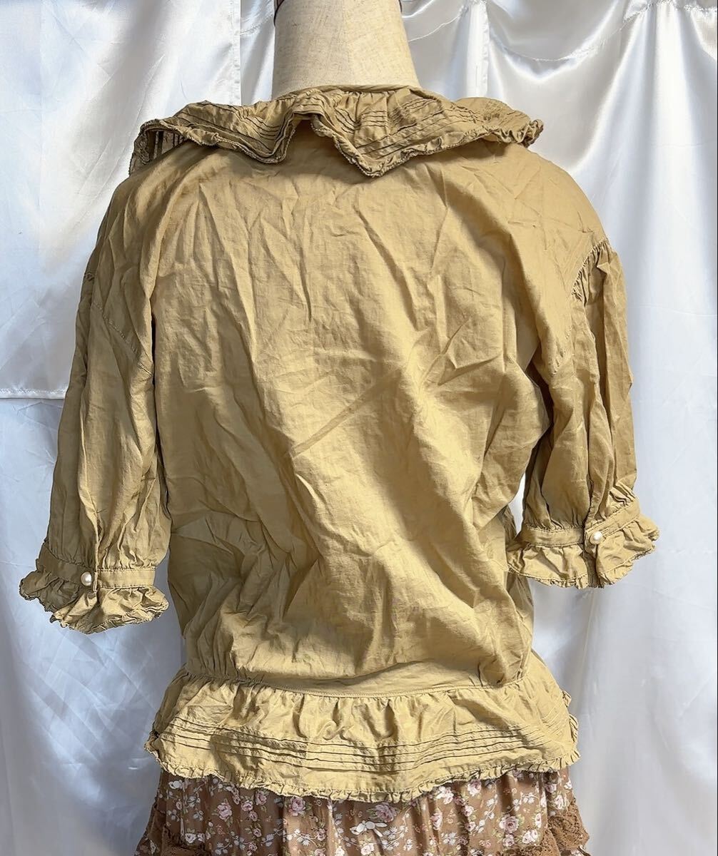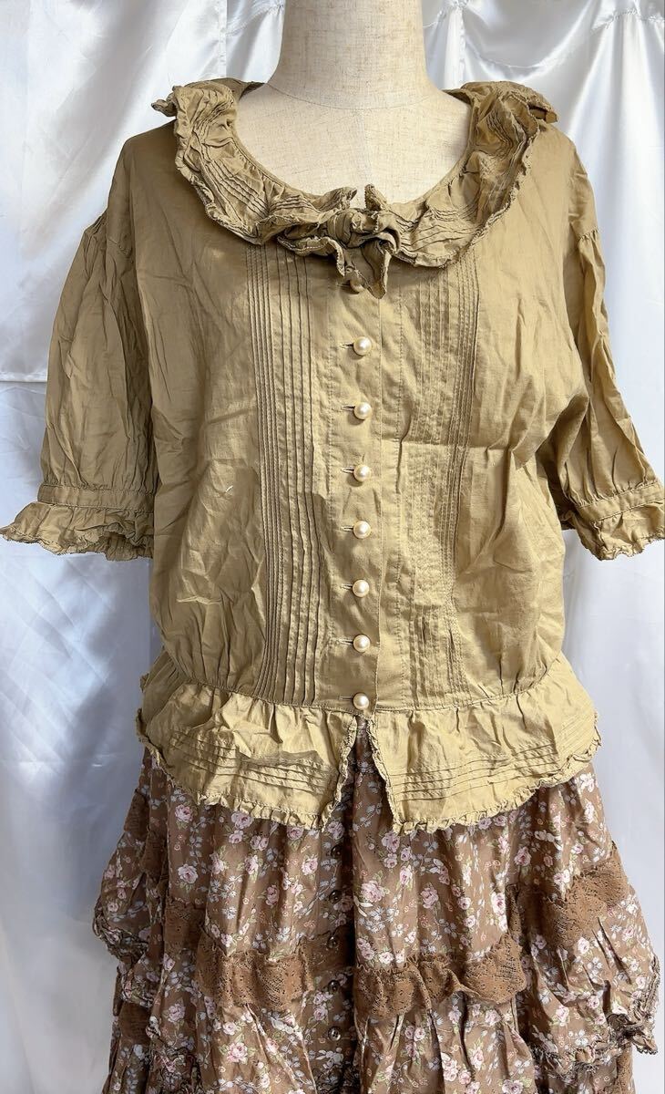 ペプラム裾やパールボタンなどクラシカルでドレッシーなデザイン、落ち着いたカーキ色などがとてもエレガントで素敵なブラウスです。 綿ローン素材なので薄くて軽い印象があります。