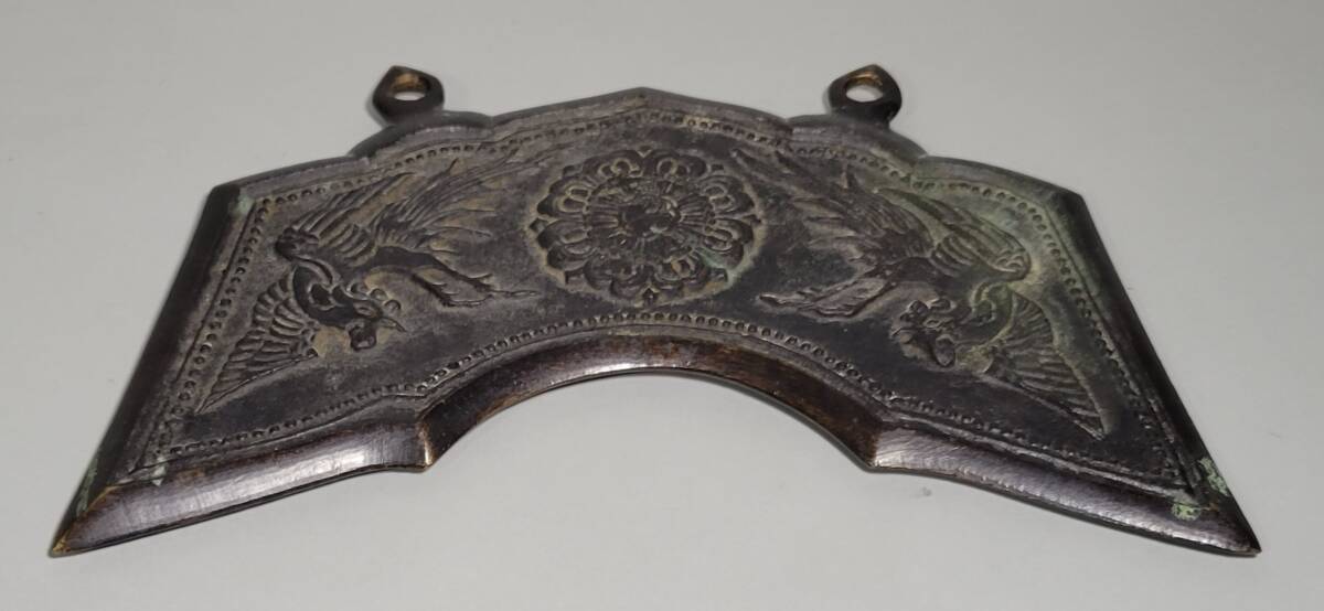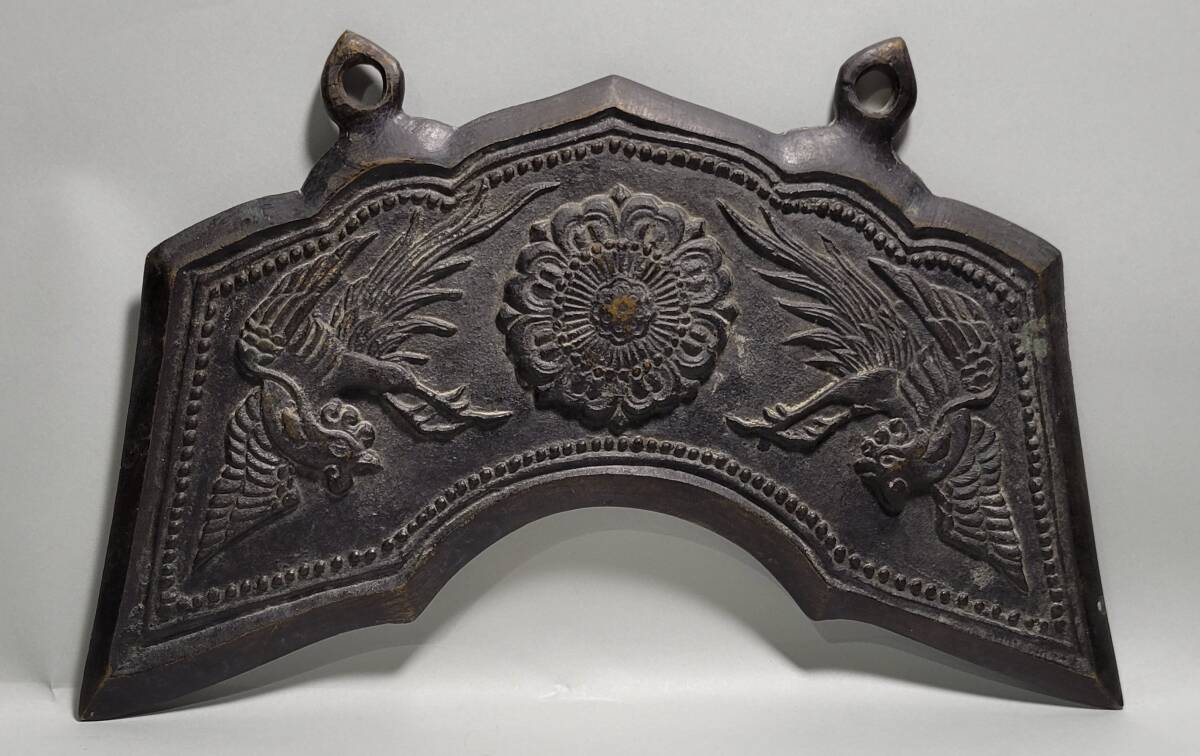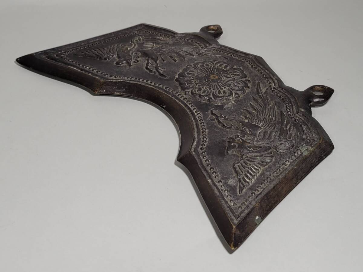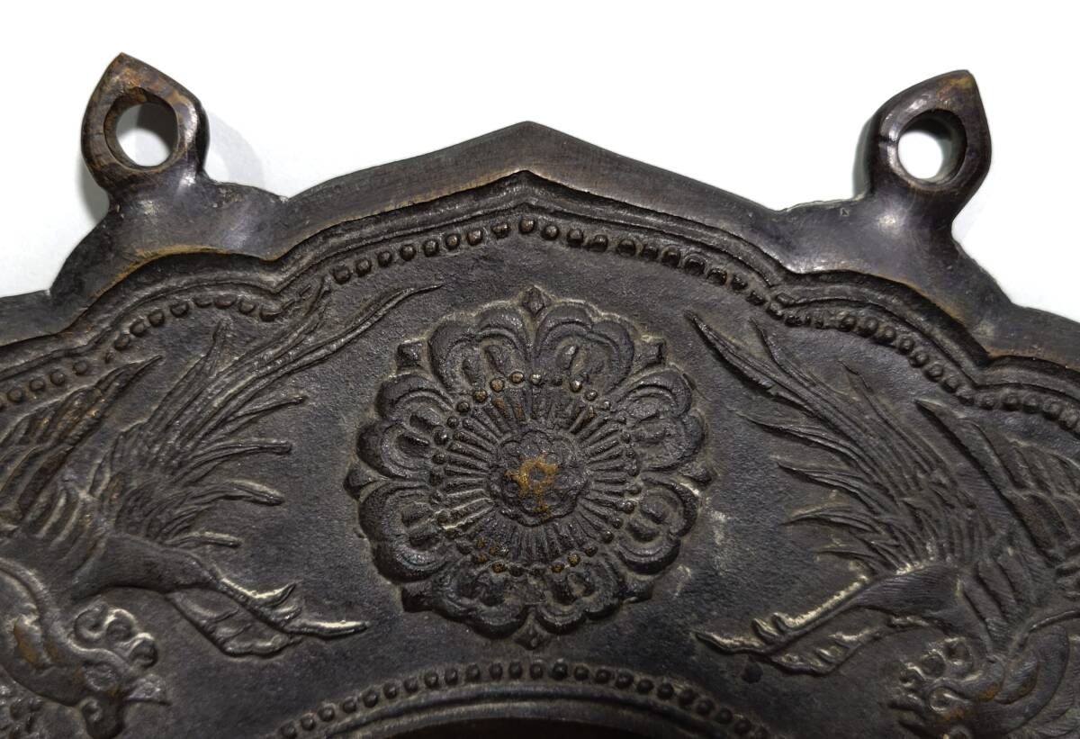 特徴 良い雰囲気の時代銅製孔雀文磬です。銅味も良く鋭い造形です。