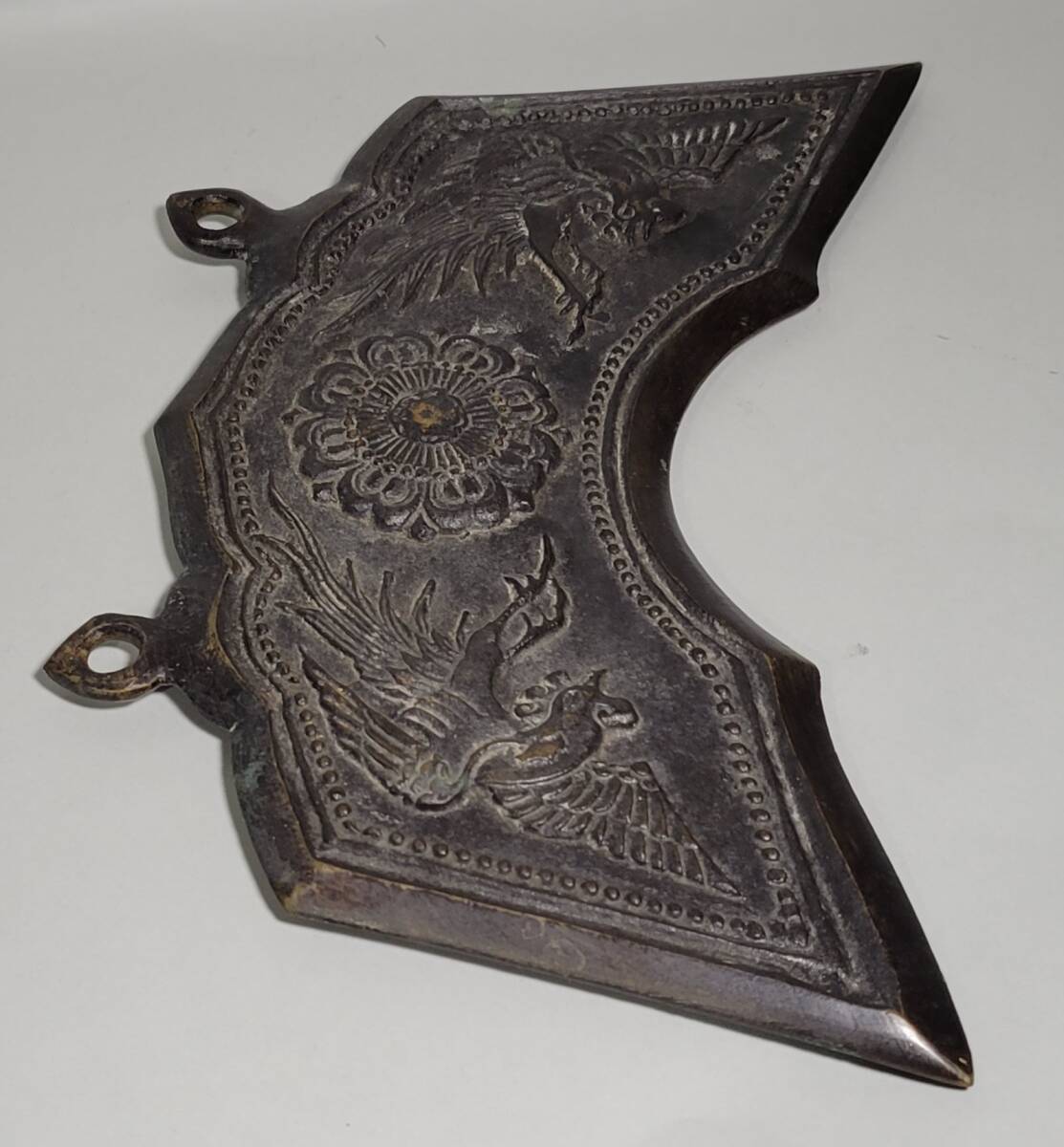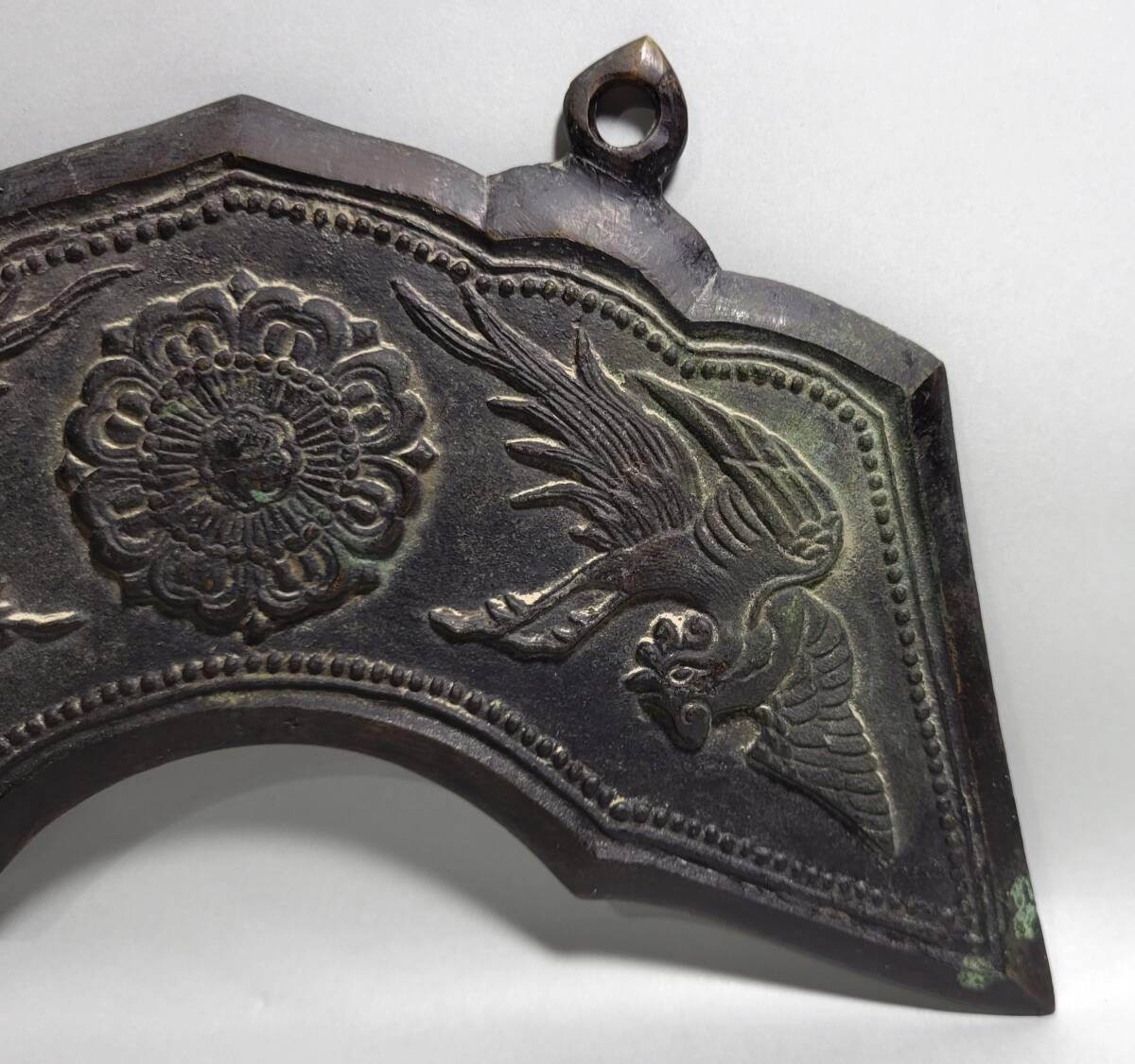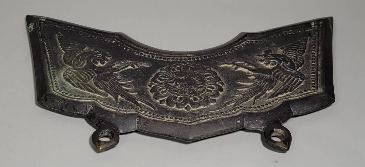 特徴 良い雰囲気の時代銅製孔雀文磬です。銅味も良く鋭い造形です。