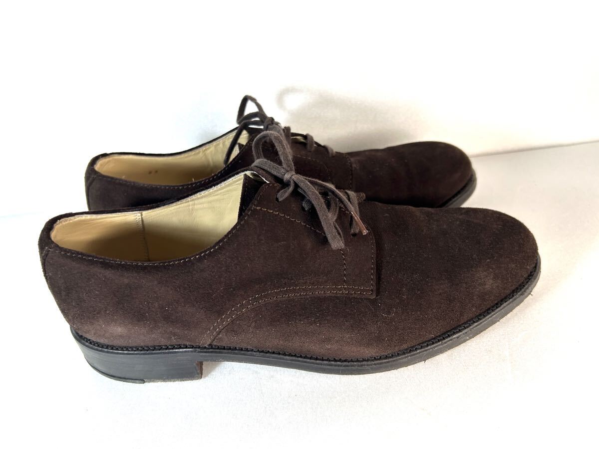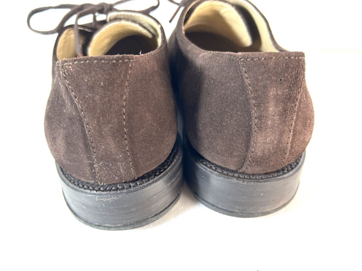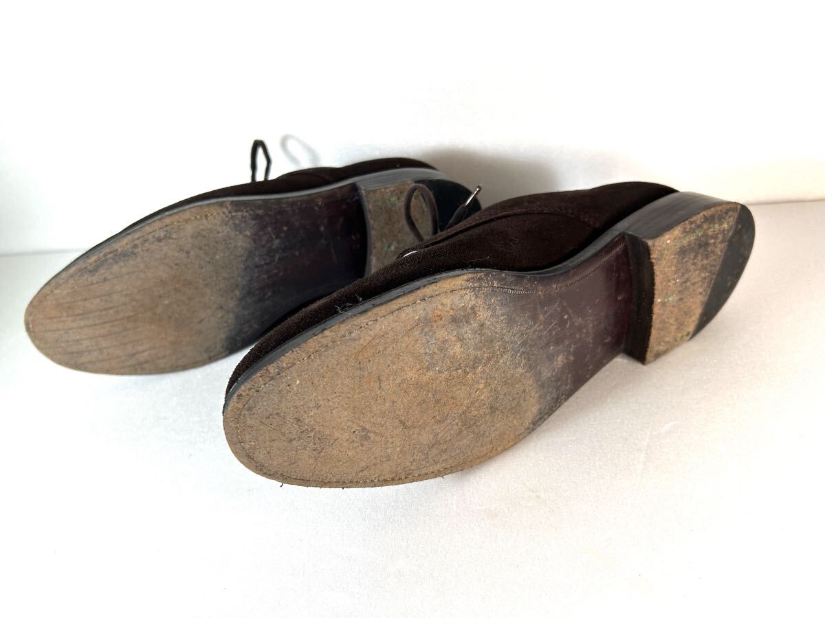 ダークブラウンのスエード素材で、シンプルなレースアップデザインの靴。