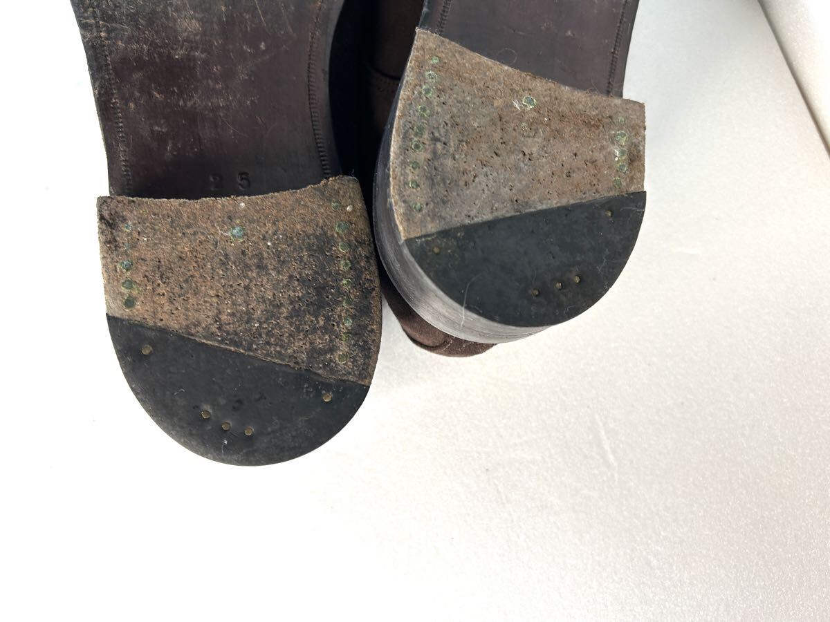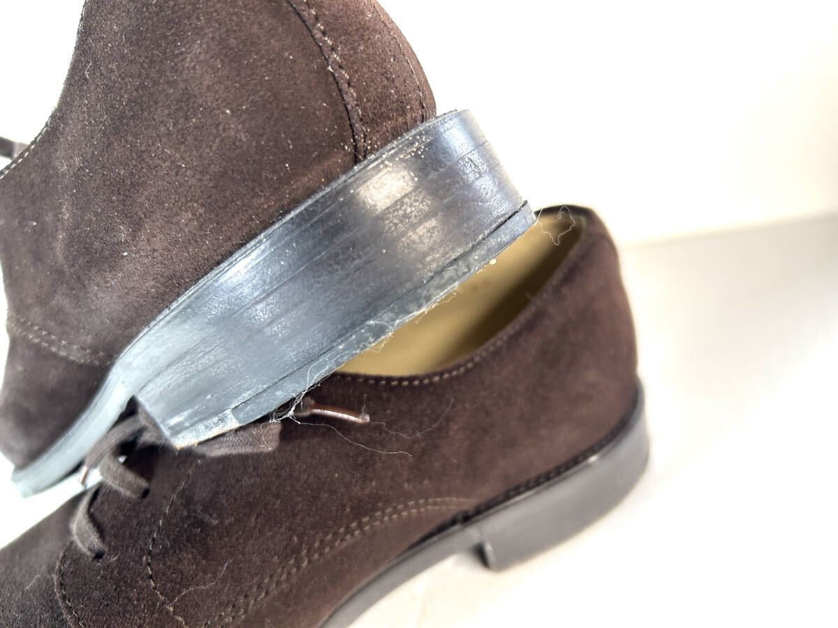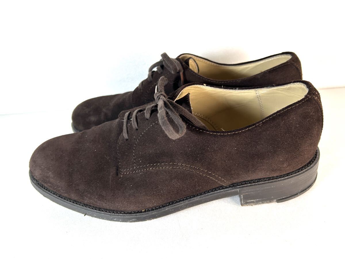 ダークブラウンのスエード素材で、シンプルなレースアップデザインの靴。