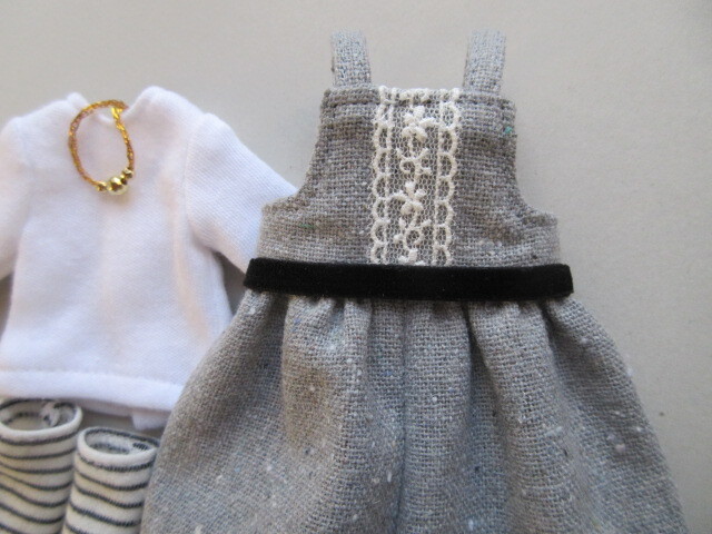 素材は綿です。ひざ下丈で裾にギャザーを寄せています。黒のベルベットリボンとペンダントをお付けいたします。