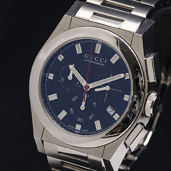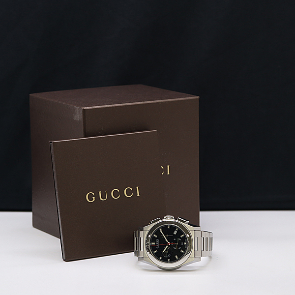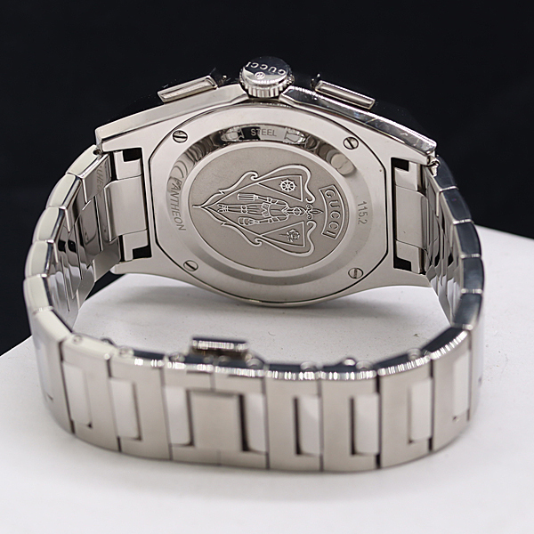 1円 保/箱付 稼働 グッチ パンテオン クロノグラフ 115.2 14201431 QZ ブラック文字盤 メンズ腕時計 4645300 12ANT SMZ