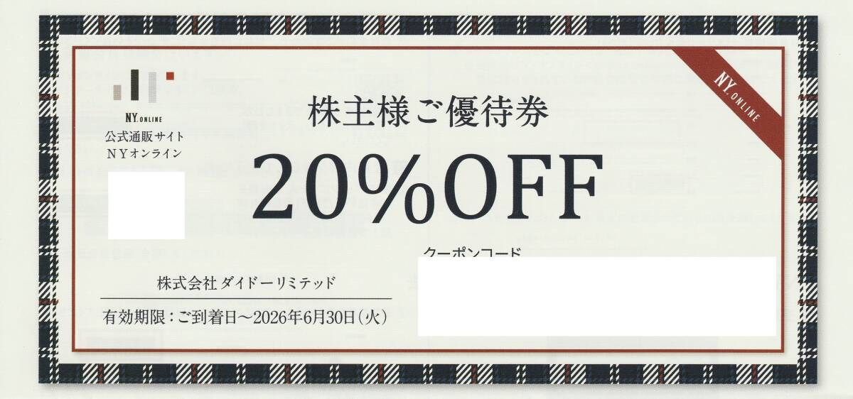 ダイドーリミテッド(NYオンライン)☆株主優待20%OFF券 クーポンコード最大6個