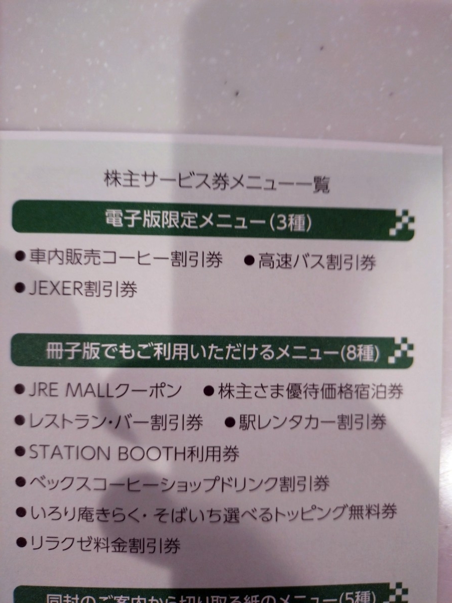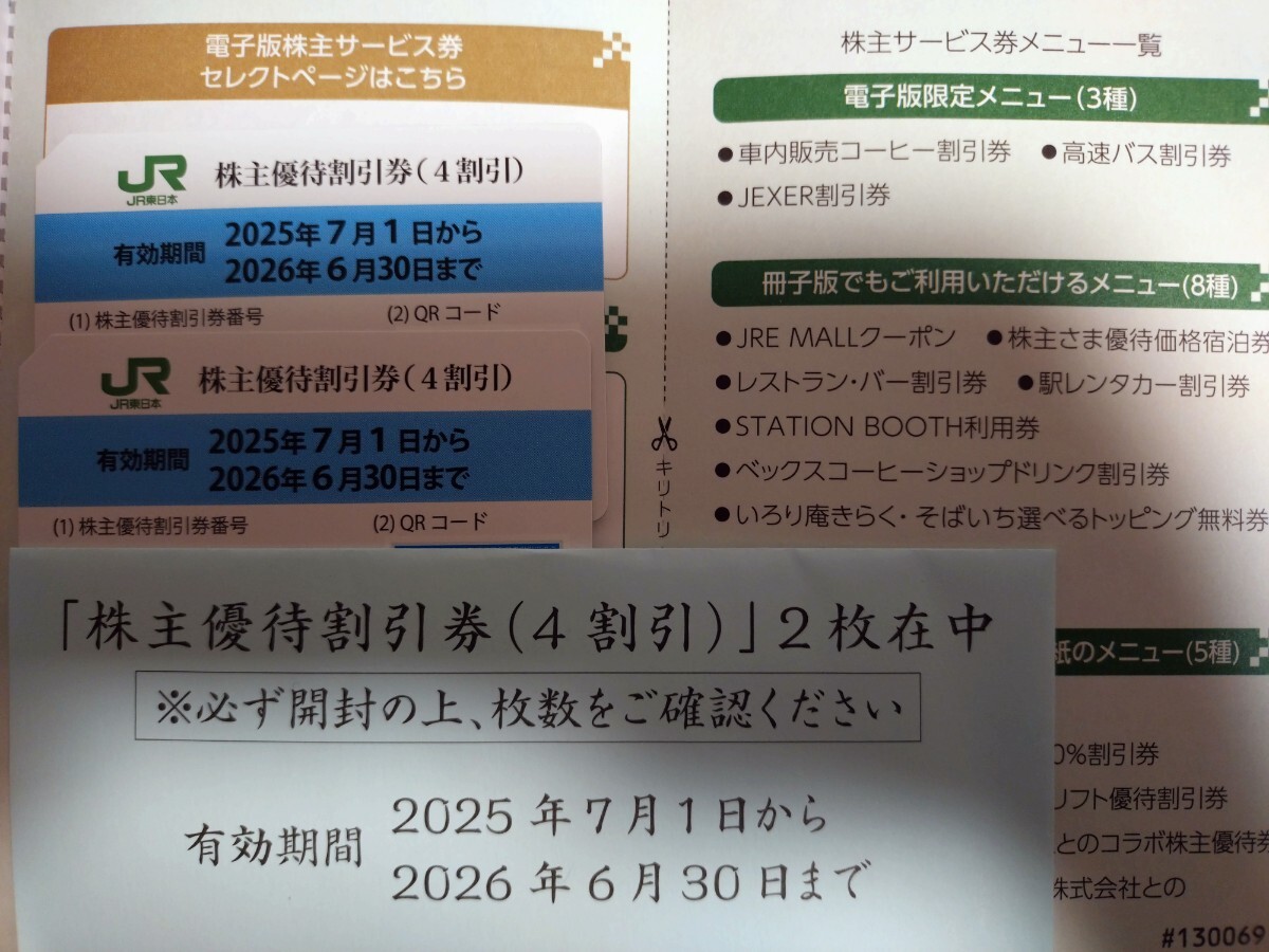 JR東日本株主優待割引券2枚と電子版株主サービス券です。期限はいずれも2026年6月30日です。