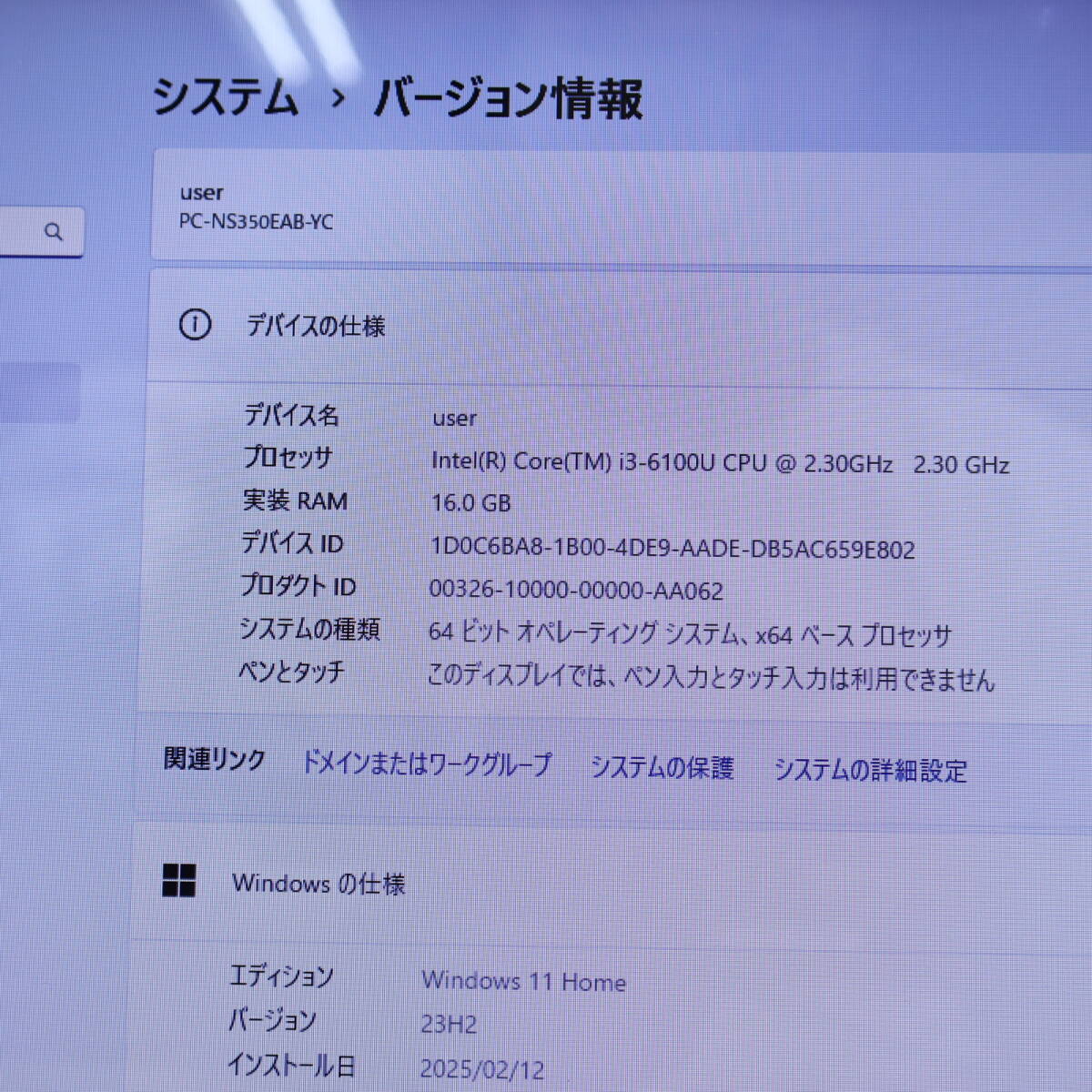 ★美品 高性能6世代i3!新品SSD256GB メモリ16GB★NS350E Core i3-6100U Webカメラ Win11 MS Office2019 H&B ノートパソコン★P91237