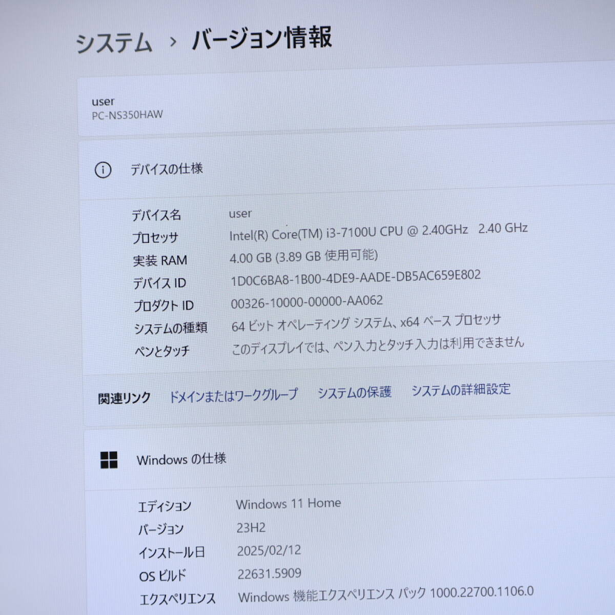 ★超美品 高性能7世代i3!大容量1TB★NS350H Core i3-7100U Webカメラ Win11 MS Office2019 Home&Business 中古品 ノートパソコン★P93146