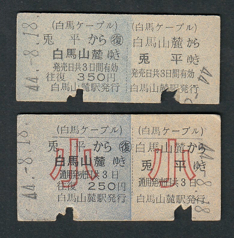 昭和44年  白馬ケーブル  白馬山麓から兎平ゆき  A型・B型  大小 往復乗車券
