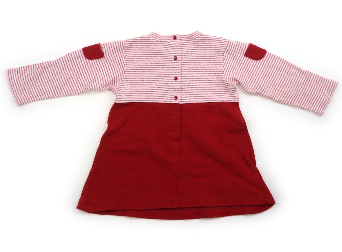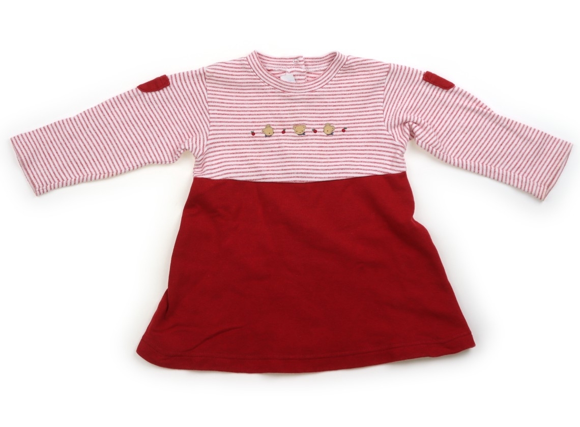 上部は綿ポリエステル生地で、スカートは綿の薄手トレーナーのような生地です。裾の折り返しが5cmほどほつれています。上部にややよれ、右袖に大きめの黄色いシミあり。