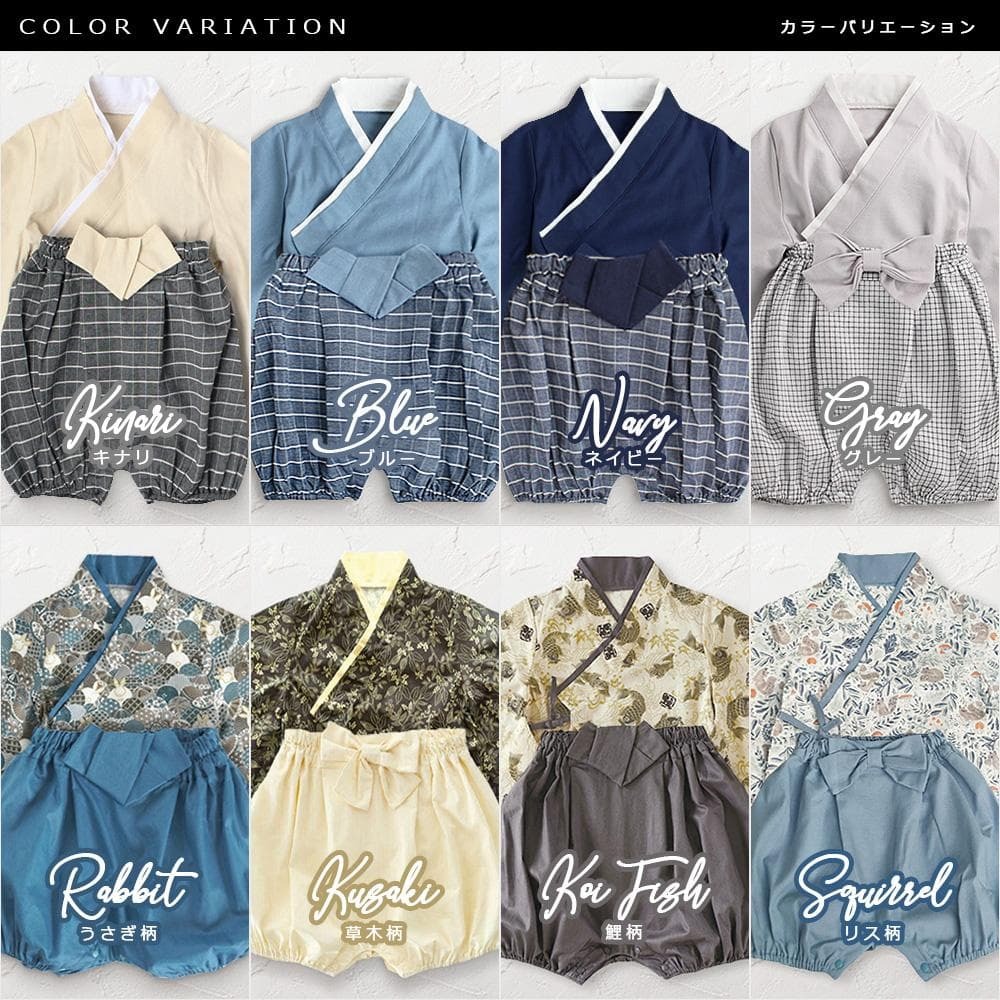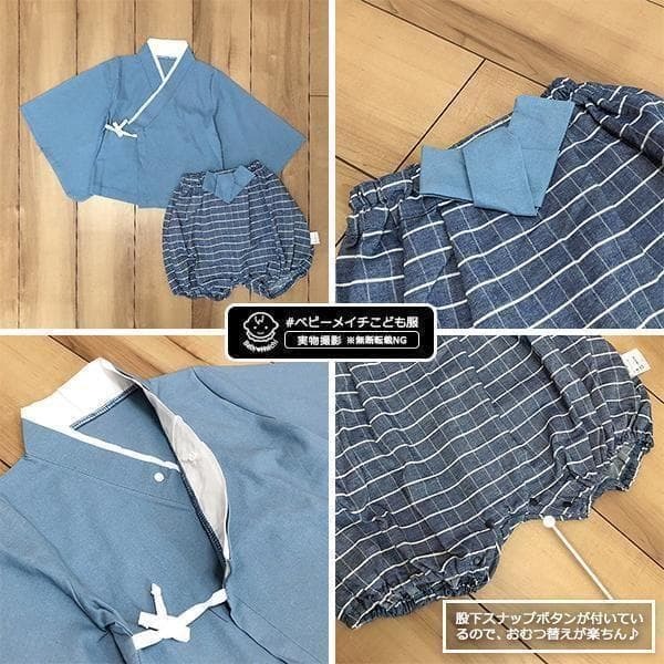 セパレートタイプのベビーキッズ袴、上下2点セットです!上は短肌着や甚平のように紐とスナップボタンで脱ぎ着ができ、かぼちゃパンツは股スナップボタンで全開にできるのでおむつ替えも楽ちん♪お宮参りやお食い初め、初節句のお祝い、お正月、七夕、お祭りなど幅広いシーンで活躍します!