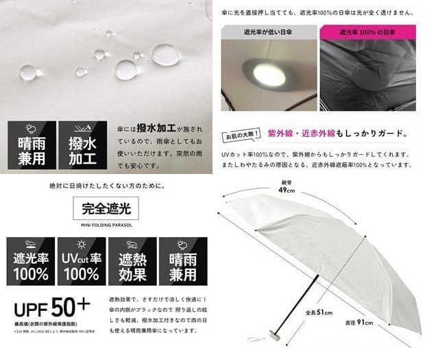 ◆完全遮光・遮光率100%・UVカット100% ◆折り畳み時長さ約16cmのコンパクト ◆晴雨兼用5段折り畳み傘 |