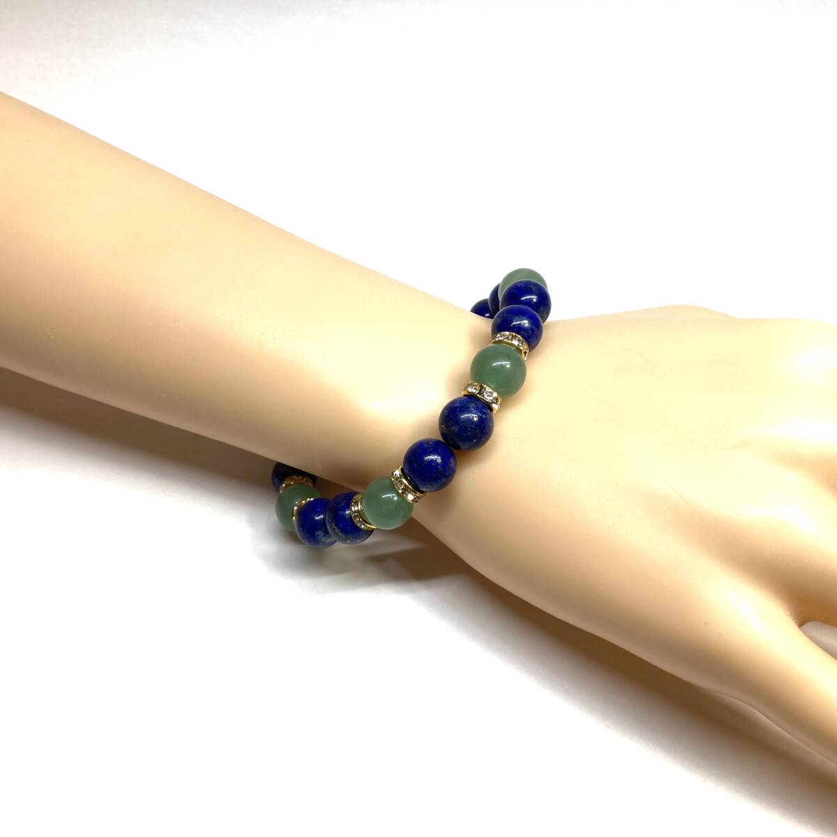 こちらは、ラピスラズリとアベンチュリンを組み合わせたパワーストーンブレスレットです。間にはロンデルを挟み高級感あるデザインに仕上げております。石大きさは腕にも馴染みやすいように10mm玉で内径約18cm(伸可能)です。(サイズ変更の場合は取引ナビにてご連絡をお願いします。) 数に限りがございますので気になる方はお早めにどうぞ。