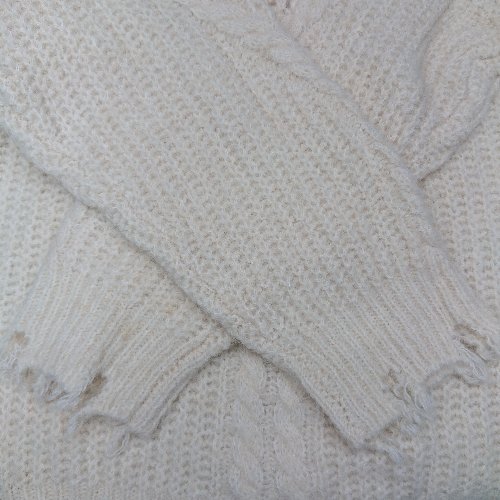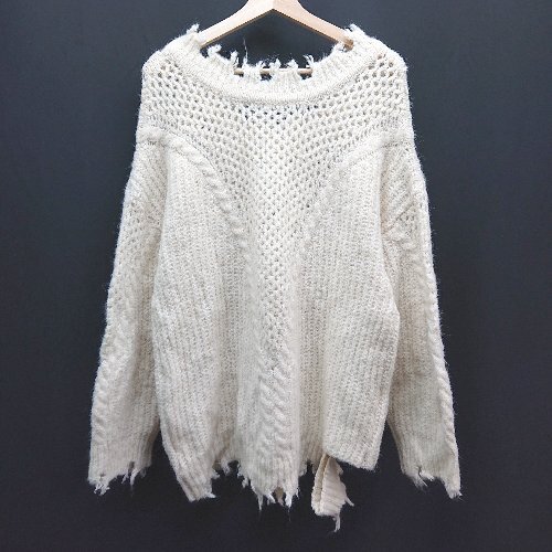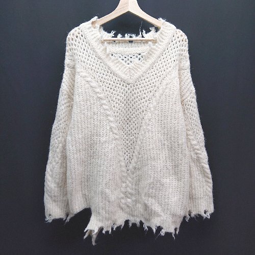 ◇ w closet ダブルクローゼット ダメージ加工 ケーブル Vネック 起毛 長袖 ニット サイズF クリーム レディース E