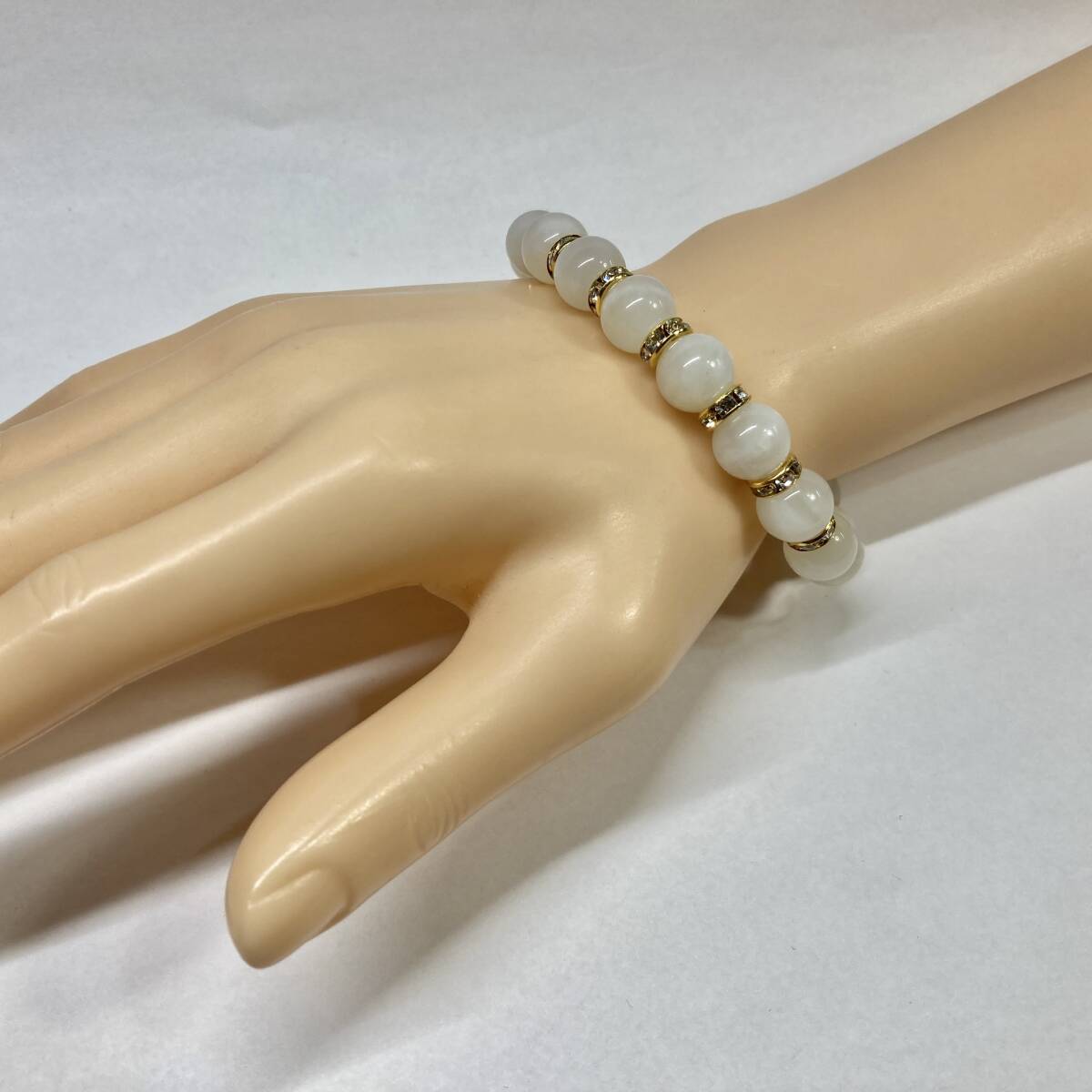 こちらは、10mm玉のムーンストーンを使用したパワーストーンブレスレットです。シンプルなデザインは、男女問わずどんなコーディネートとも合わせ易いブレスレットです。サイズは内周約18cmです。(サイズ変更の場合は取引ナビにてご連絡をお願いします。)数に限りがございますので気になる方はお早めにどうぞ。
