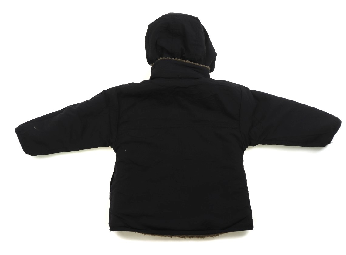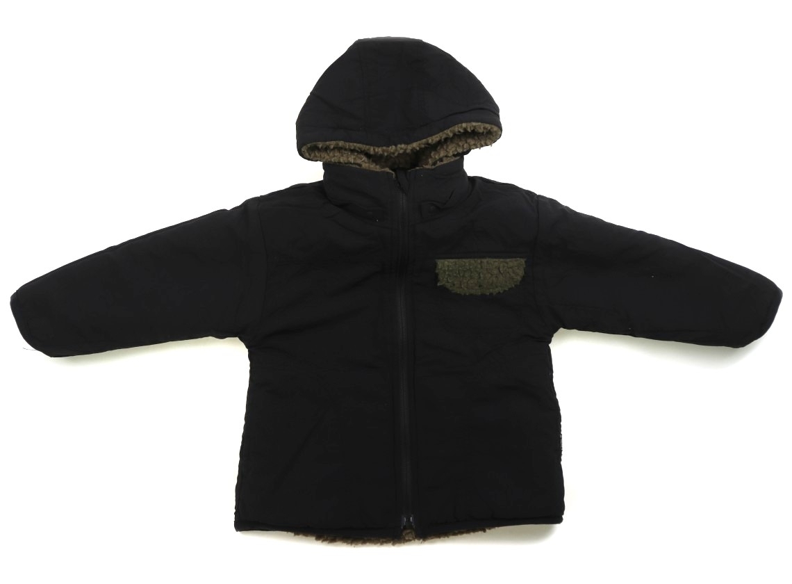 ポリエステル素材。ボア素材の裏地付き。リバーシブル仕様。フードの取り外しが可能です。ボアに毛羽立ちがあります。