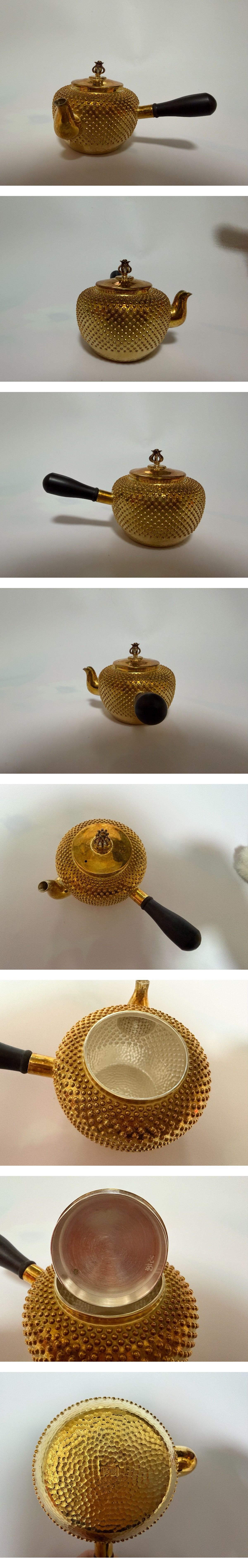 時代 純銀製 光南造 金メッキ 玉霰打出 花蕾摘 横手急須 工芸品 美術品 銀瓶 煎茶道具