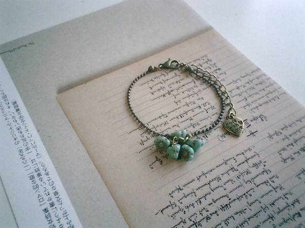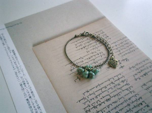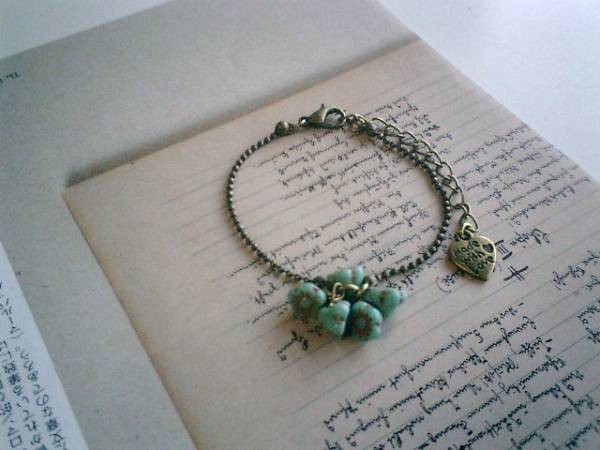 ガールズ・レッスン・・シリーズです♪可憐なチェコのお花のブレスレットです♪シックなターコイズ色のお花がやさしい表情です♪8ミリ位のチェコのお花に繊細なボールチェーンを合わせました♪長さは16センチ+アジャスター6センチで最長22センチ位です♪お揃いのネックレスやイヤリングも出品しています♪シンプルで飽きのこないいつまでも着けられるデザインを考えて作りました!ハンドメイドをご理解頂いてノークレーム、ノーリターンでお願いします