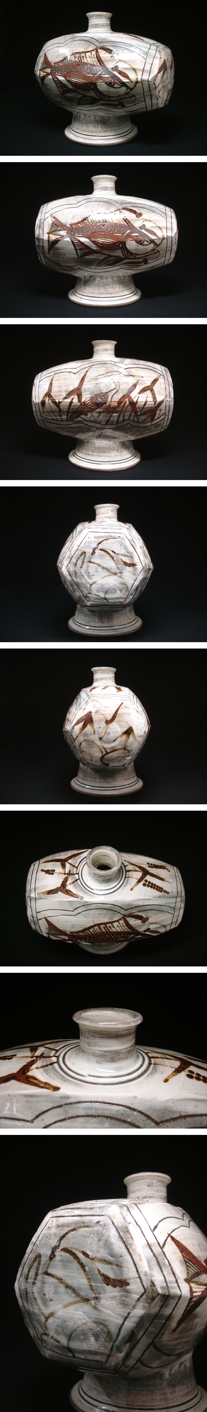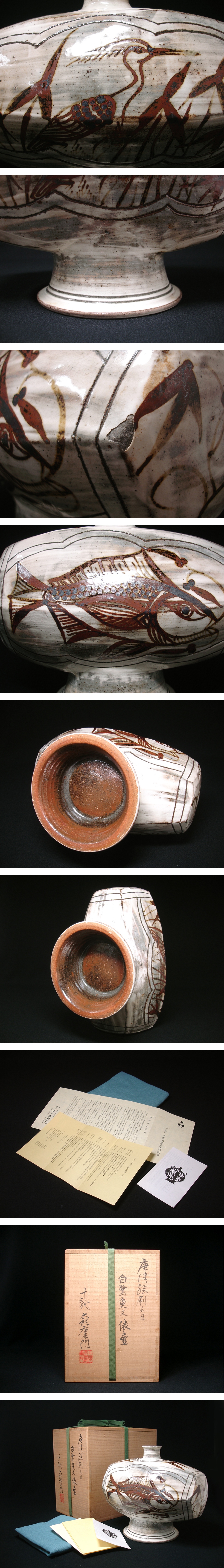 慶應◆日本芸術院会員【13代中里太郎右衛門(逢庵)】本人作 唐津絵刷毛目 白鷺魚文俵壷 共箱付
