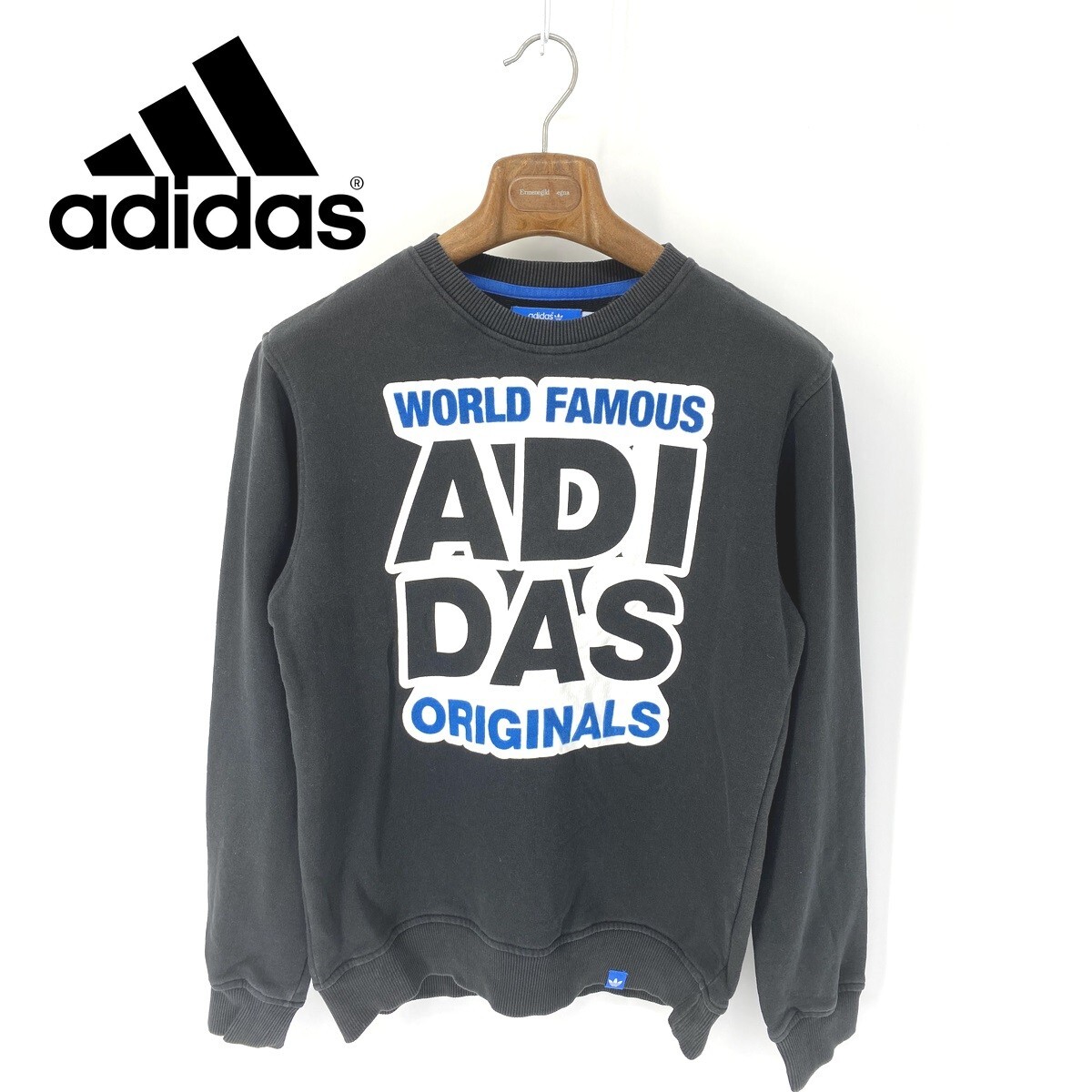 A6072/美品 春夏 adidas Originals アディダスオリジナルス world famous プリント ビッグロゴ コットン 丸首 長袖 トレーナー S 黒/メンズ
