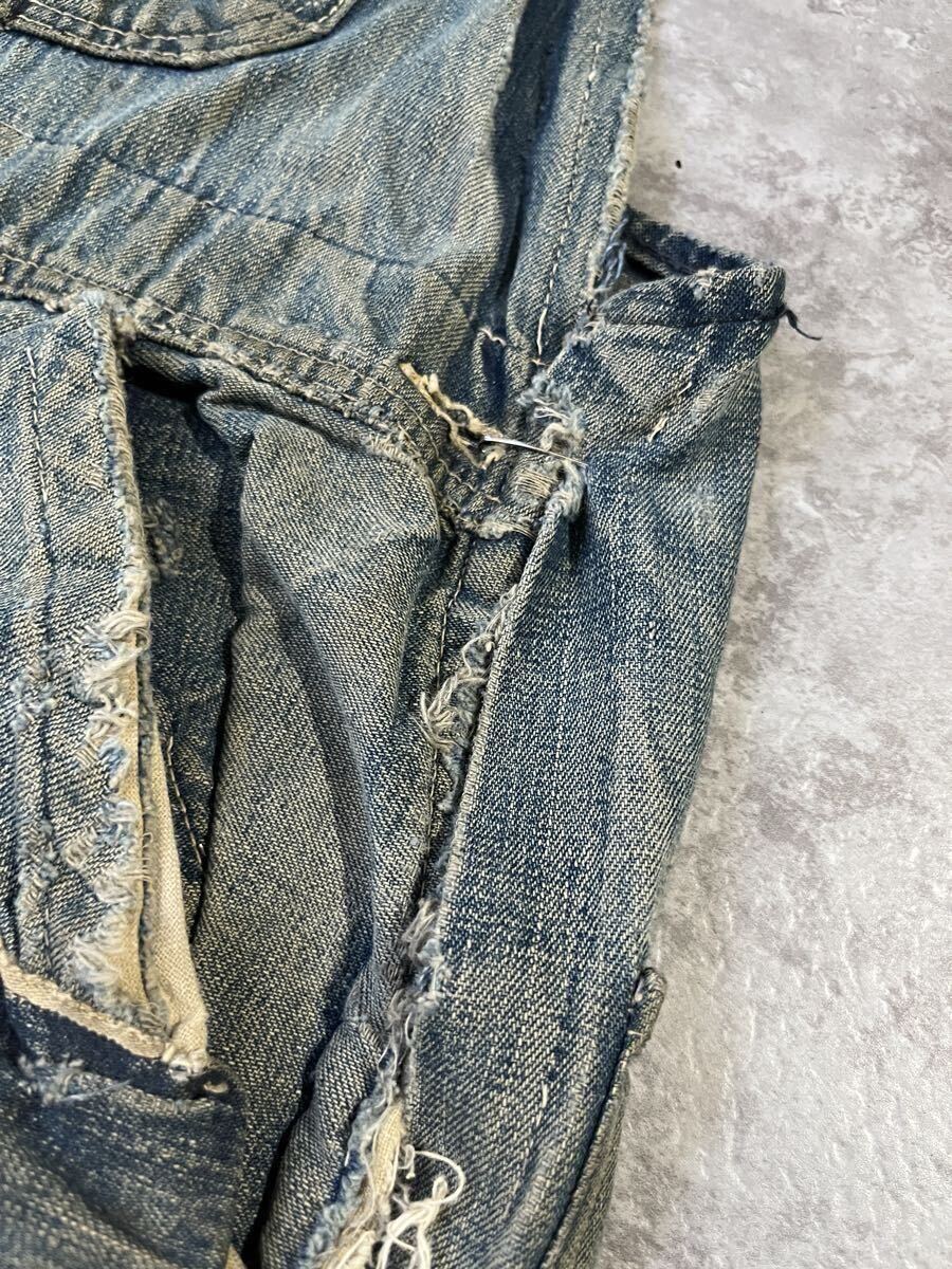 実際の労働現場で着用され続け、必要に迫られて施されたハンドリペアが全体に残る、非常に説得力のある一着です。