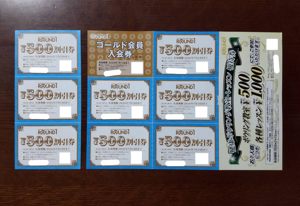 | 「ラウンドワン株主優待券●500円割引8枚・ゴールド会員入会券1枚・ ボウリング教室レッスン優待券1枚※有効期限2026/7/15」 |