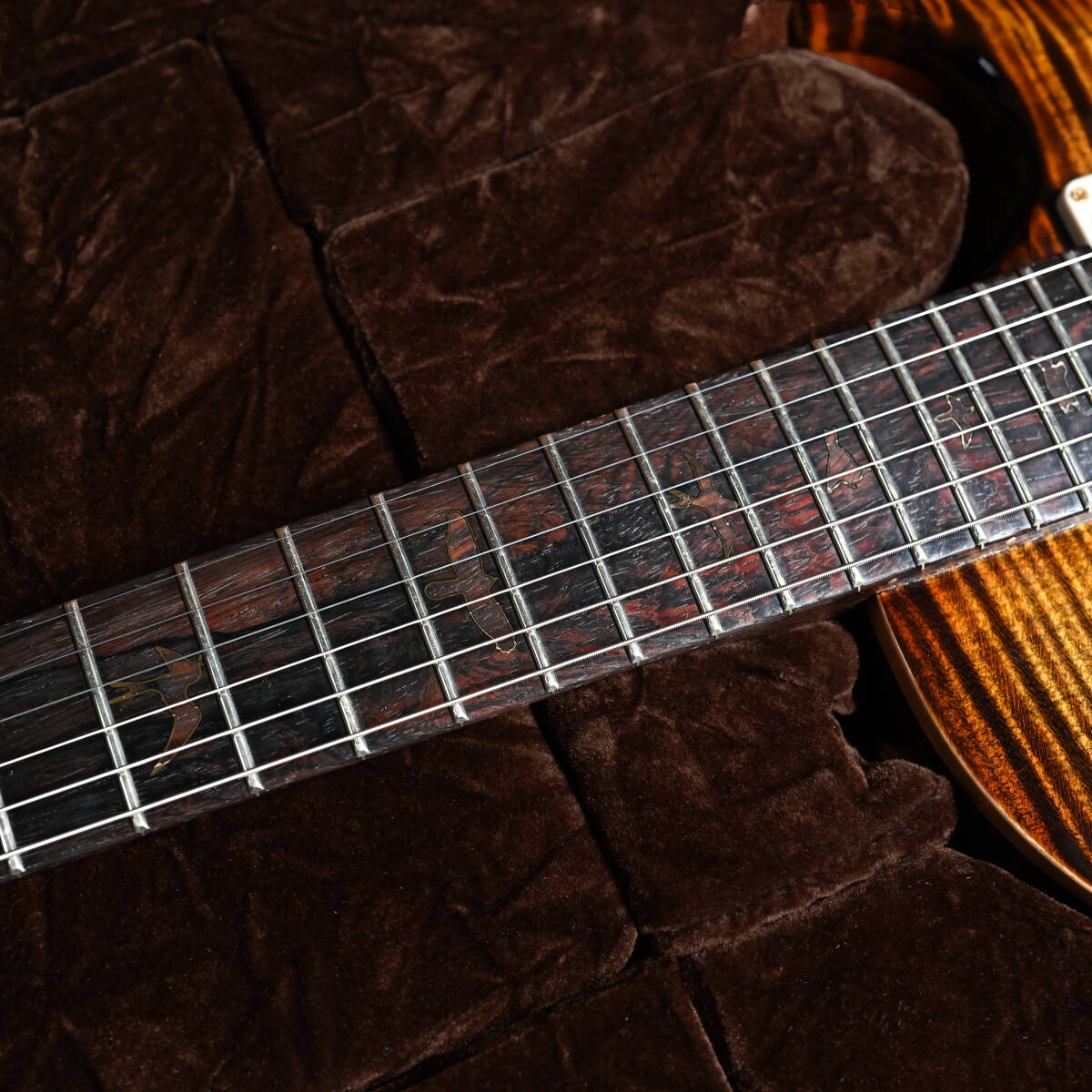 こちらは美しい杢目のフィギュアード・ブラジリアンローズウッド(ハカランダ)を指板とヘッド突板だけでなく、インレイやPSイーグルロゴ、ペグボタンに至るまで使用した特別なモデル。