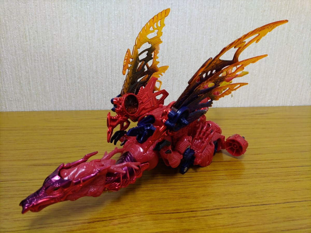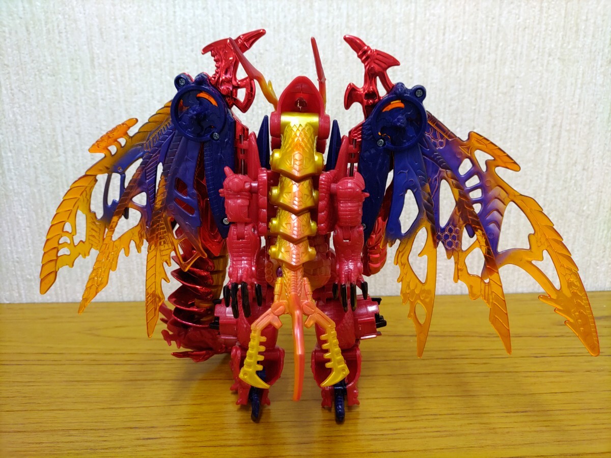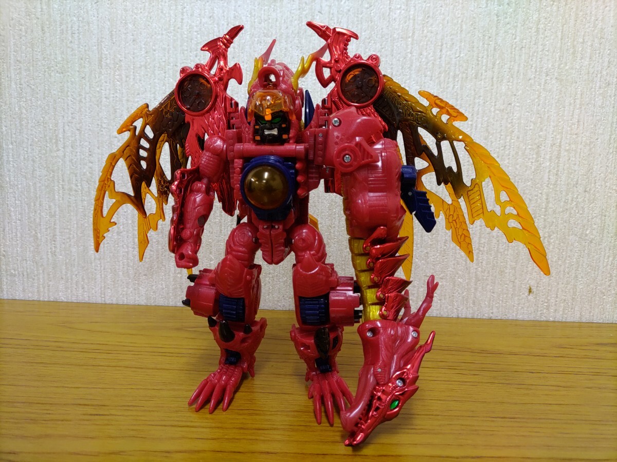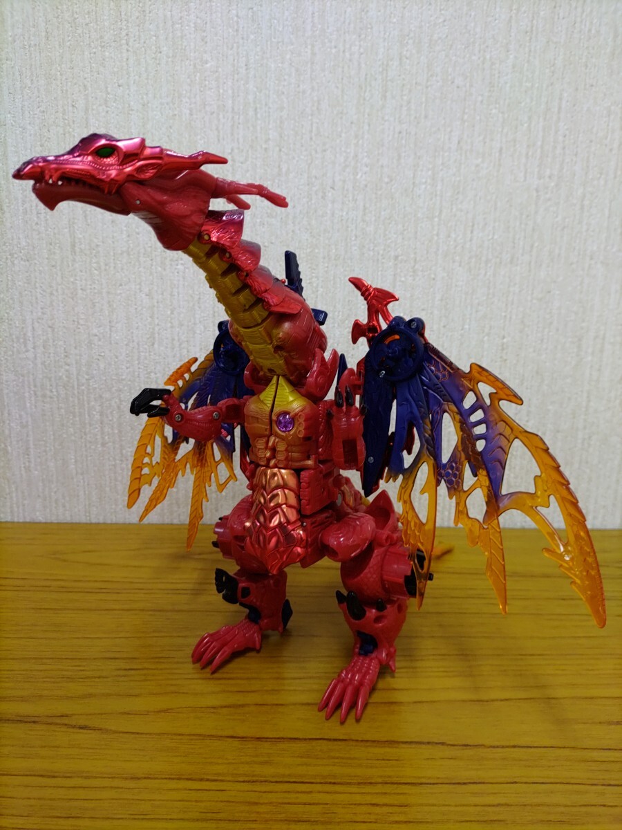 変形ロボット玩具にフィギュア的な造形やギミックを採り入れ、彩色メッキに軟質パーツやクリアパーツをふんだんに使い、ロボットからビーストとビークルの両モードに変形するというまさにビーストウォーズの集大成のような本アイテム。首もとのレバーで操演ができるドラゴンの首や左右連動する巨大な翼、行き届いた各部のロック機構などモチーフの魅力としっかり連動したギミックが魅力。また、ドラゴンのボディラインを作っていた両腕が左右に展開し、その間を胴体が回転移動するダイナミックな変形プロセスには、他のキャラクターへの共有や転用を考えずに設計されていた時代の贅沢さが偲ばれます。