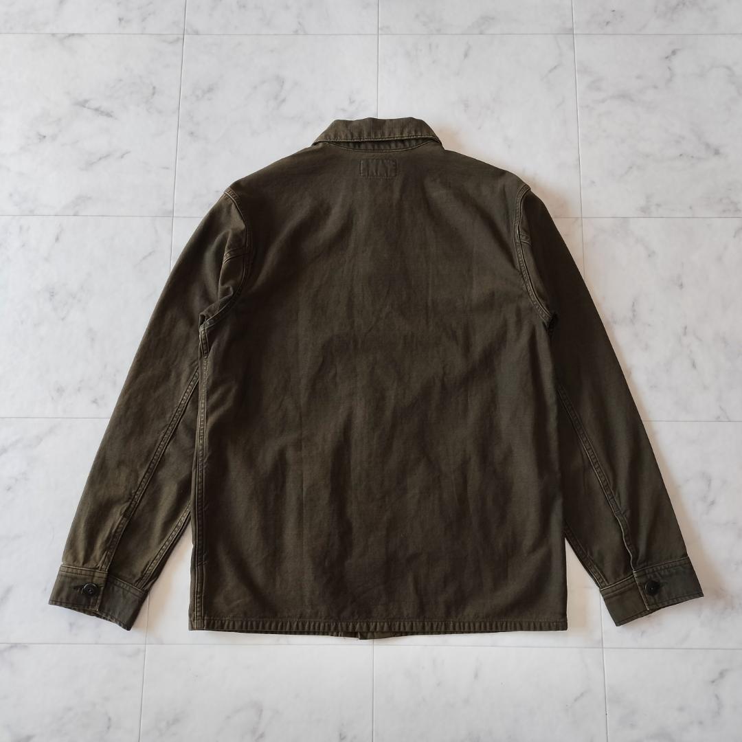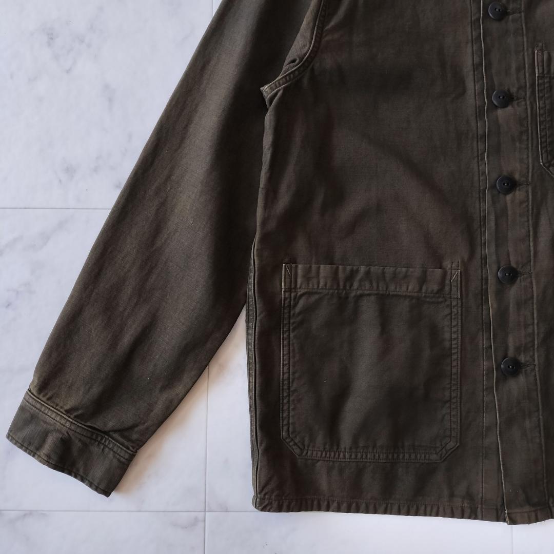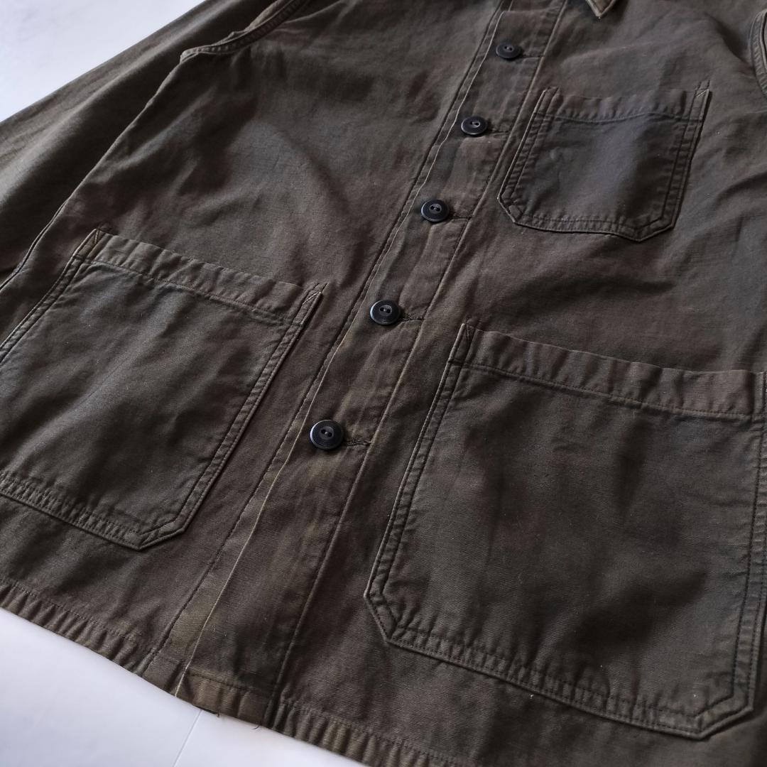 日本製のリバースサテン生地を使用し、縫製後にオーバーダイを施してウォッシュ加工で独特のトーナルな立体感を表現した上質な仕上がりです。ヴィンテージ風のコロゾボタンがクラシックな雰囲気を演出し、フレンチワークジャケットやカバーオールの要素を取り入れたデザインが魅力的です。