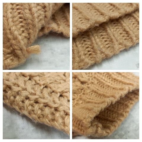 両袖と裾周りに毛玉や毛羽立ち、前裾やや右側にほつれ、ボタンに細かいキズがあります。