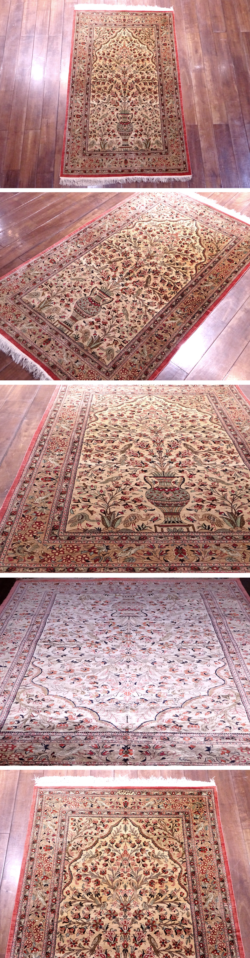 総シルク、総手織、およそ100万ノット(1cm四方の中の結び目が約100個)を誇る、これぞペルシャ絨毯といえる細密な構図や多彩な色使いがとても魅力的な高級絨毯です。     光の角度により様々に色合いを変えるシルク特有の表情、さらりとした極上の手触り。。。絨毯の繊細さと華やかさを引き立て、床の上の芸術の名に恥じぬ、見事な芸術性を備えています。     工房サインあり。