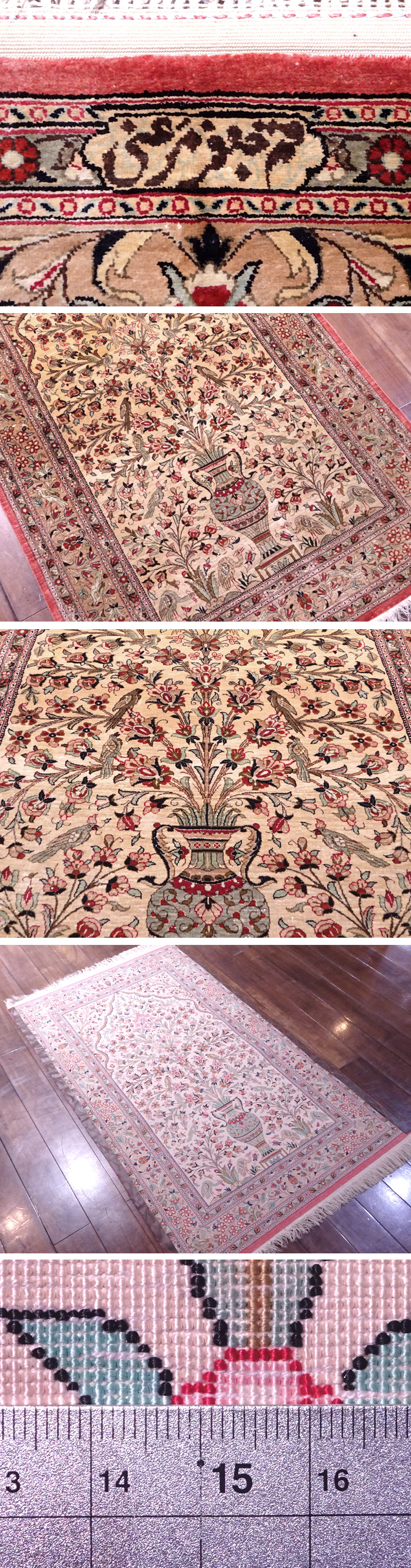 ∇花∇世界最高峰!至高のペルシャ絨毯 シルク100%総手織 ゴルダニ 花鳥文様 工房サイン 100万ノット 157.5×98cm 11