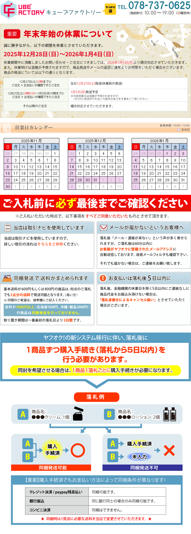 | 状態 | 未使用品ですが、開封歴と保管時に生じた傷み汚れ、外箱には伝票を剥がした跡などがございます。 ご了承のうえ、お求めください。 |