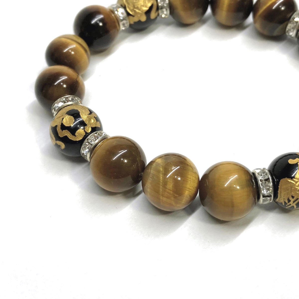 こちらは、四神獣金彫オニキとタイガーアイを組み合わせたパワーストーンブレスレットです。四神獣は、中国の伝説で4つの方向(東西南北)を守護する神聖な神。四神獣、厄災から身を守り、多くの運気を呼び込むと言われております。石大きさは程よくインパクトのある12mm玉で内周 約17cmです。 数に限りがございますので気になる方はお早めにどうぞ。