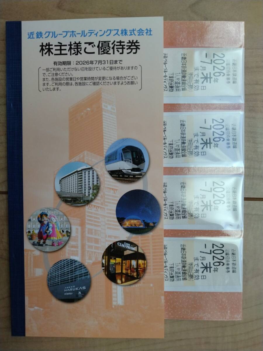近鉄ホールディングスの株主優待でいただいた乗車券4枚と優待冊子1冊です。