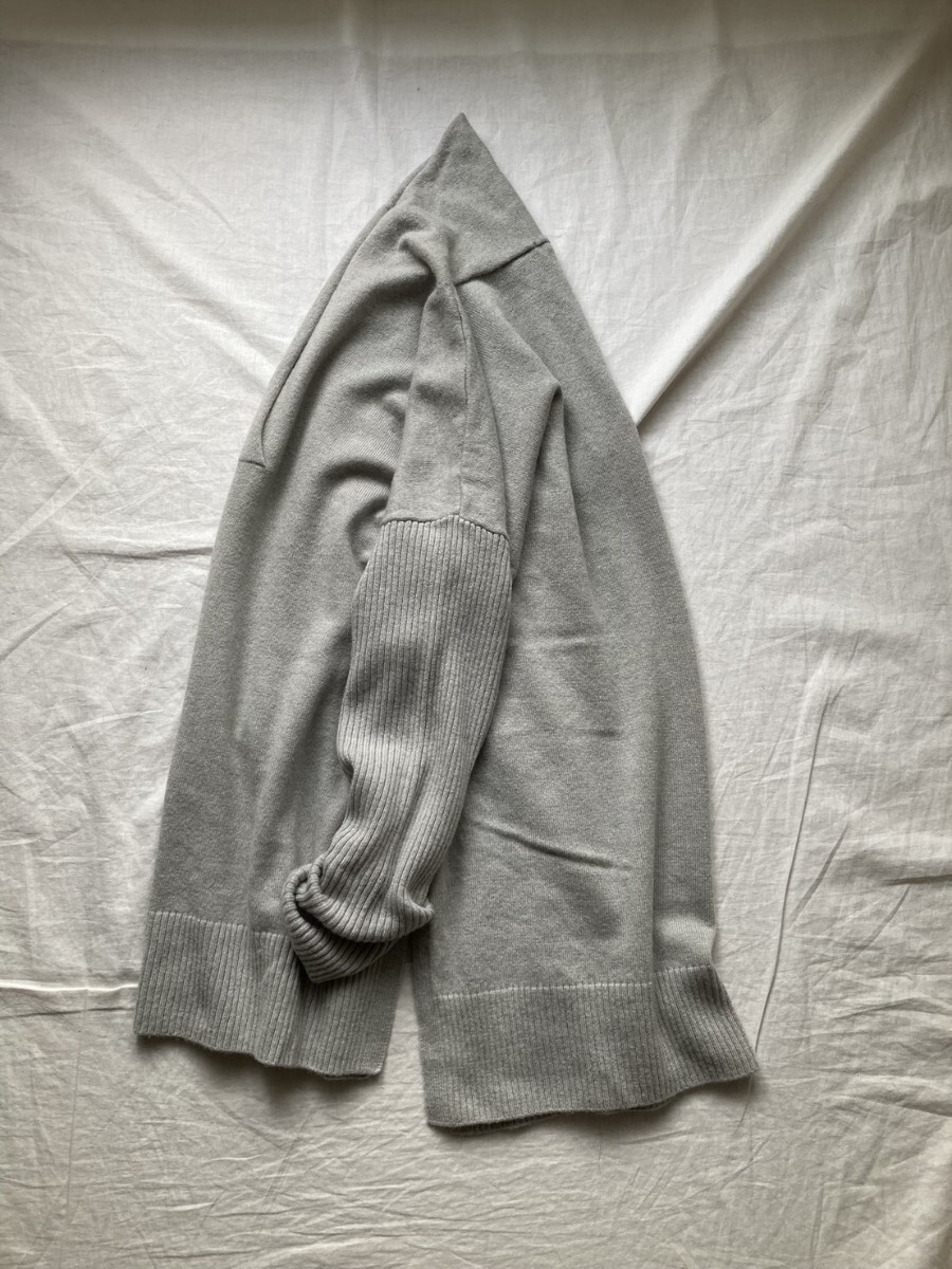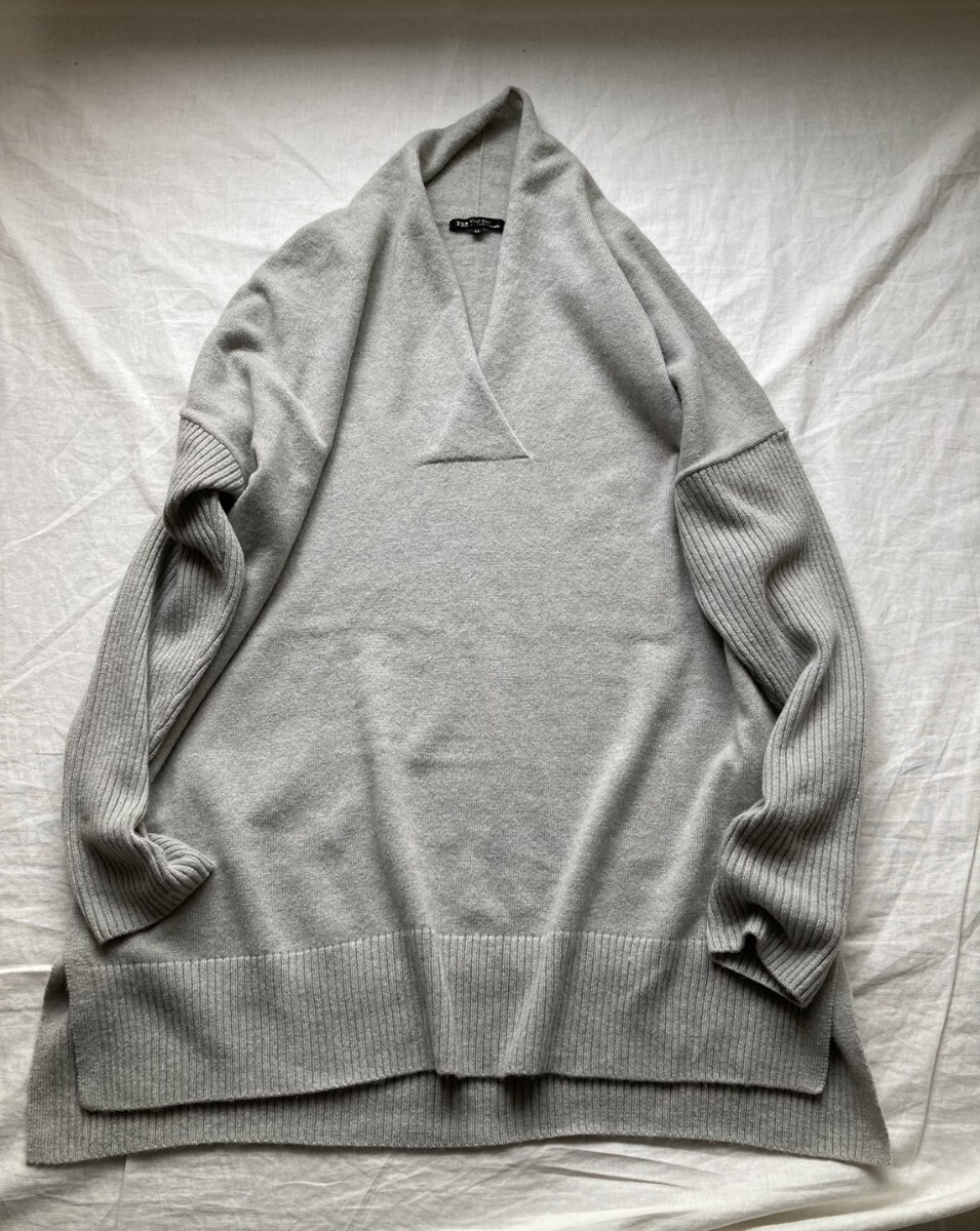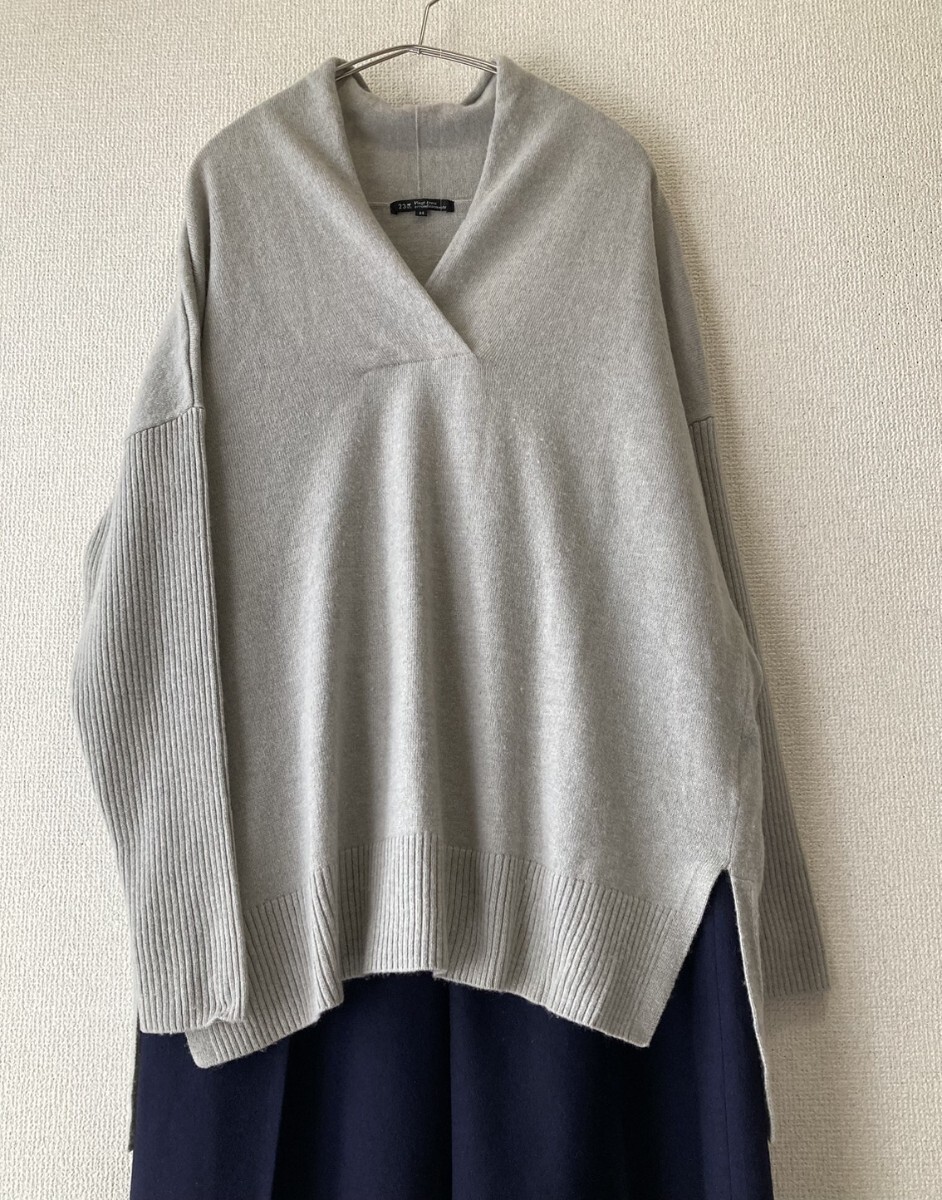 ふわっと柔らかなカシミヤ混のニットで、程よくゆったりとしたシルエットのニットです。首元があたたかいショールカラーで女性らしい雰囲気も素敵です。