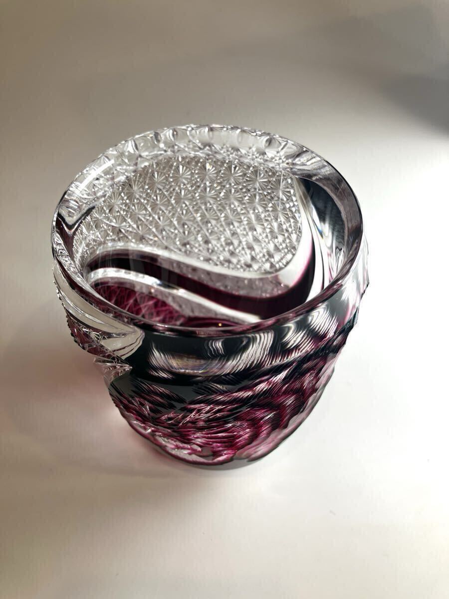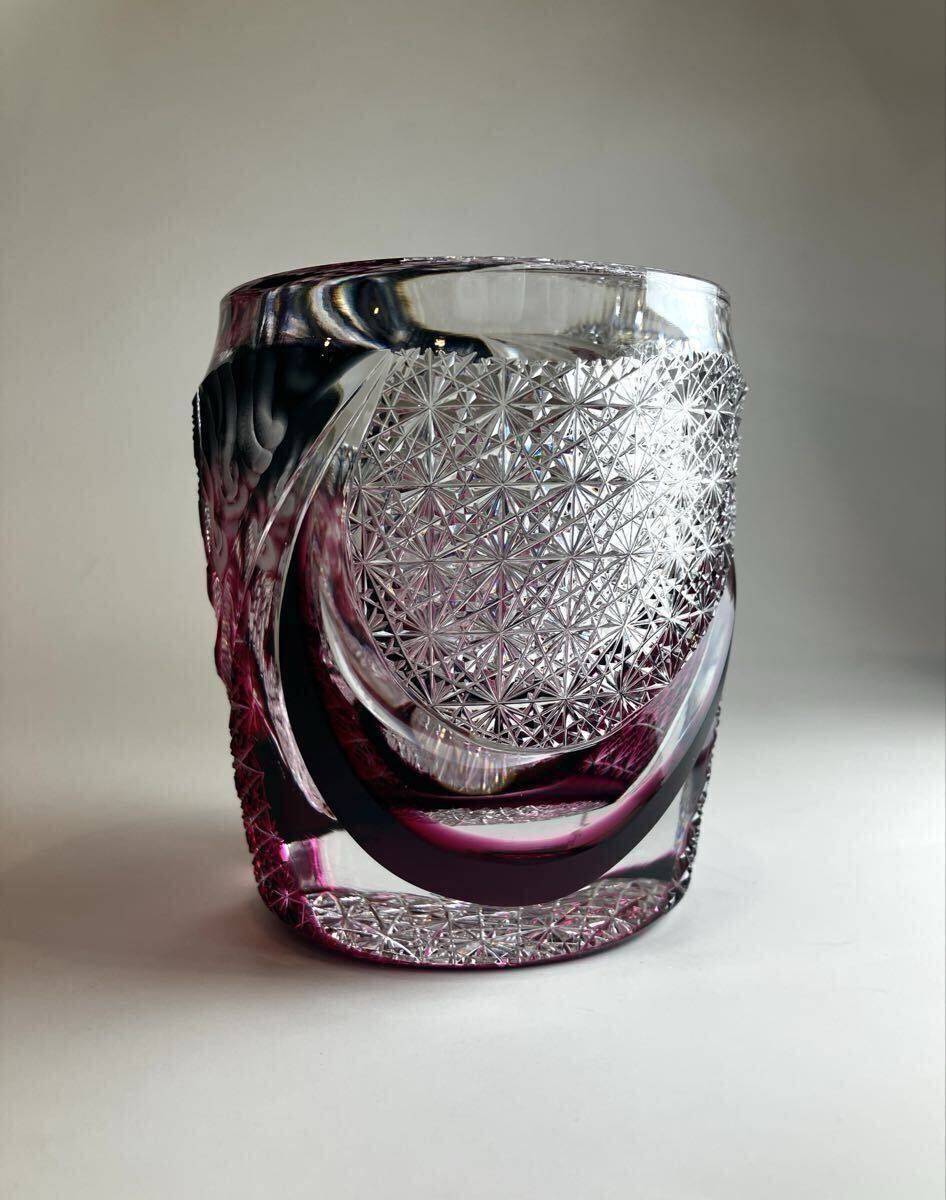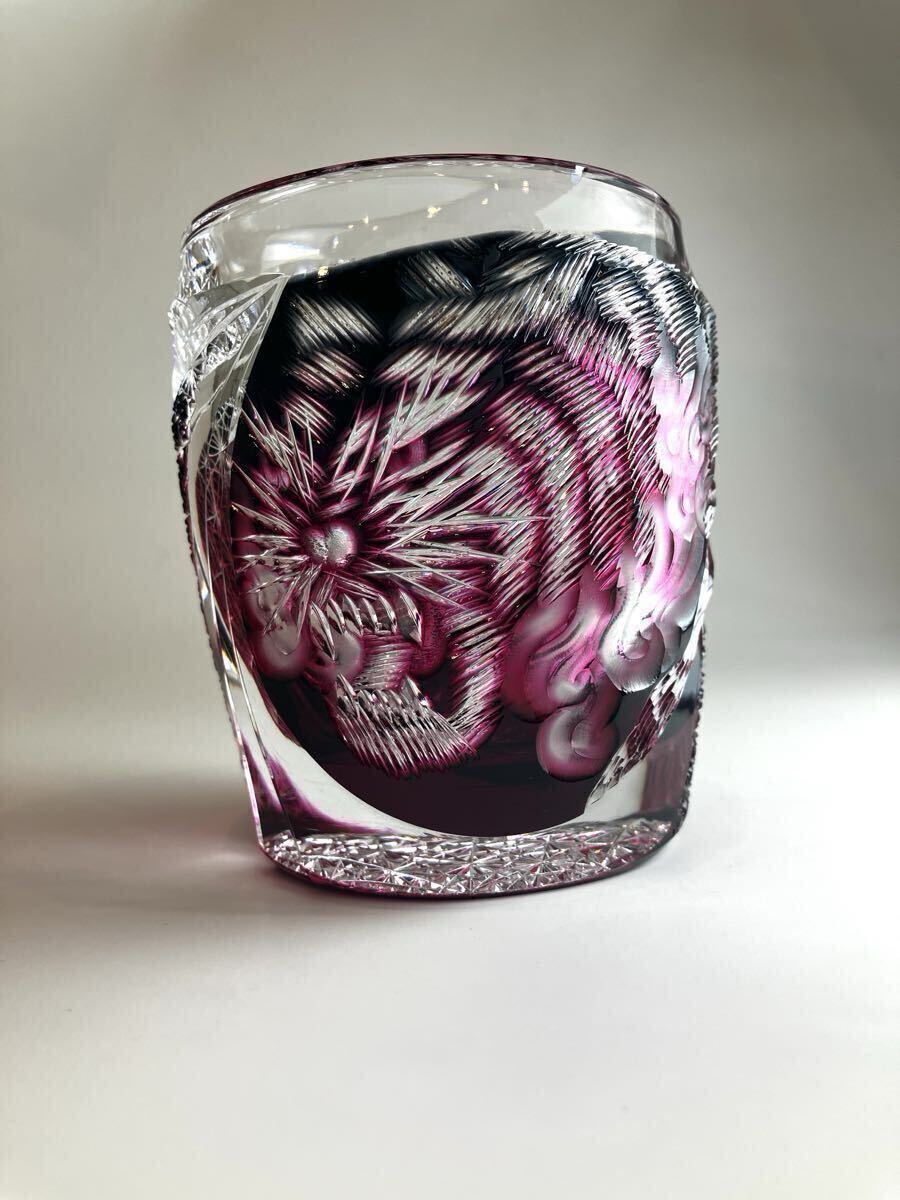 切子の素材は宙吹きで重厚感があり、2色被せでクリアガラスの上に、上部に黒、下部に金赤のガラスを被せた珍しい素材に彫り込まれています。