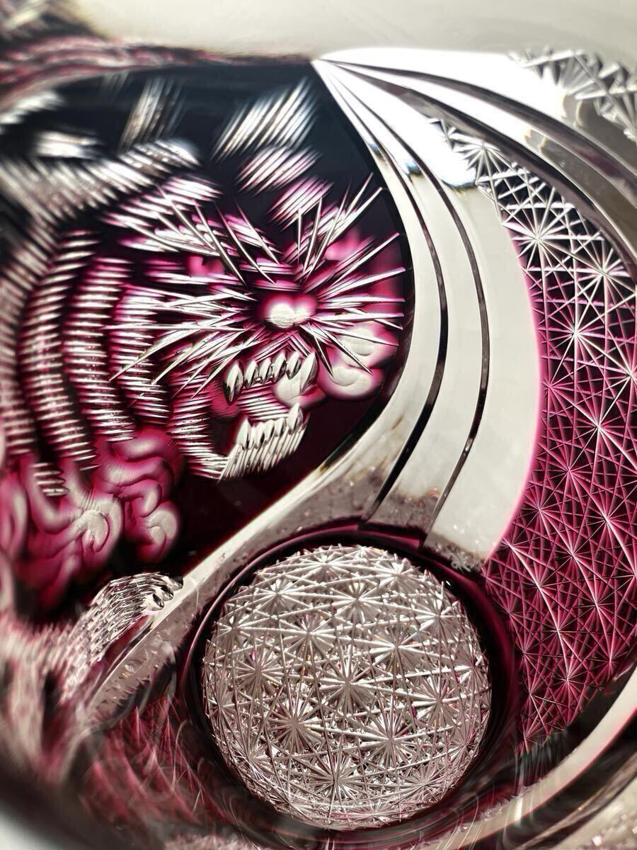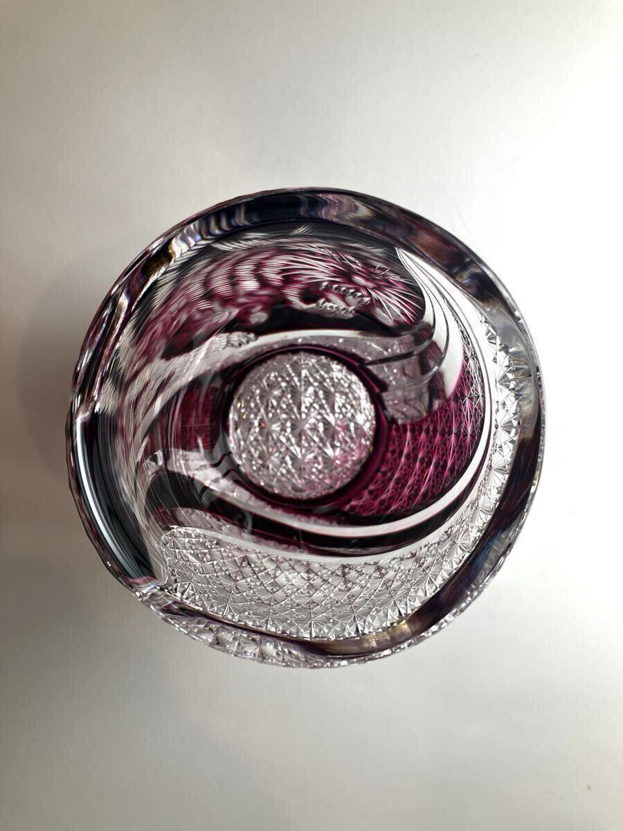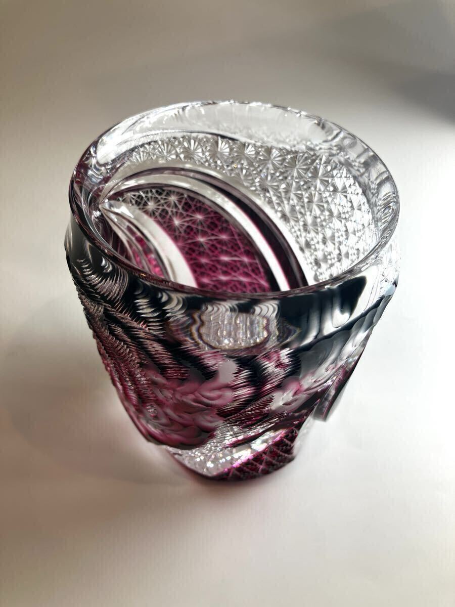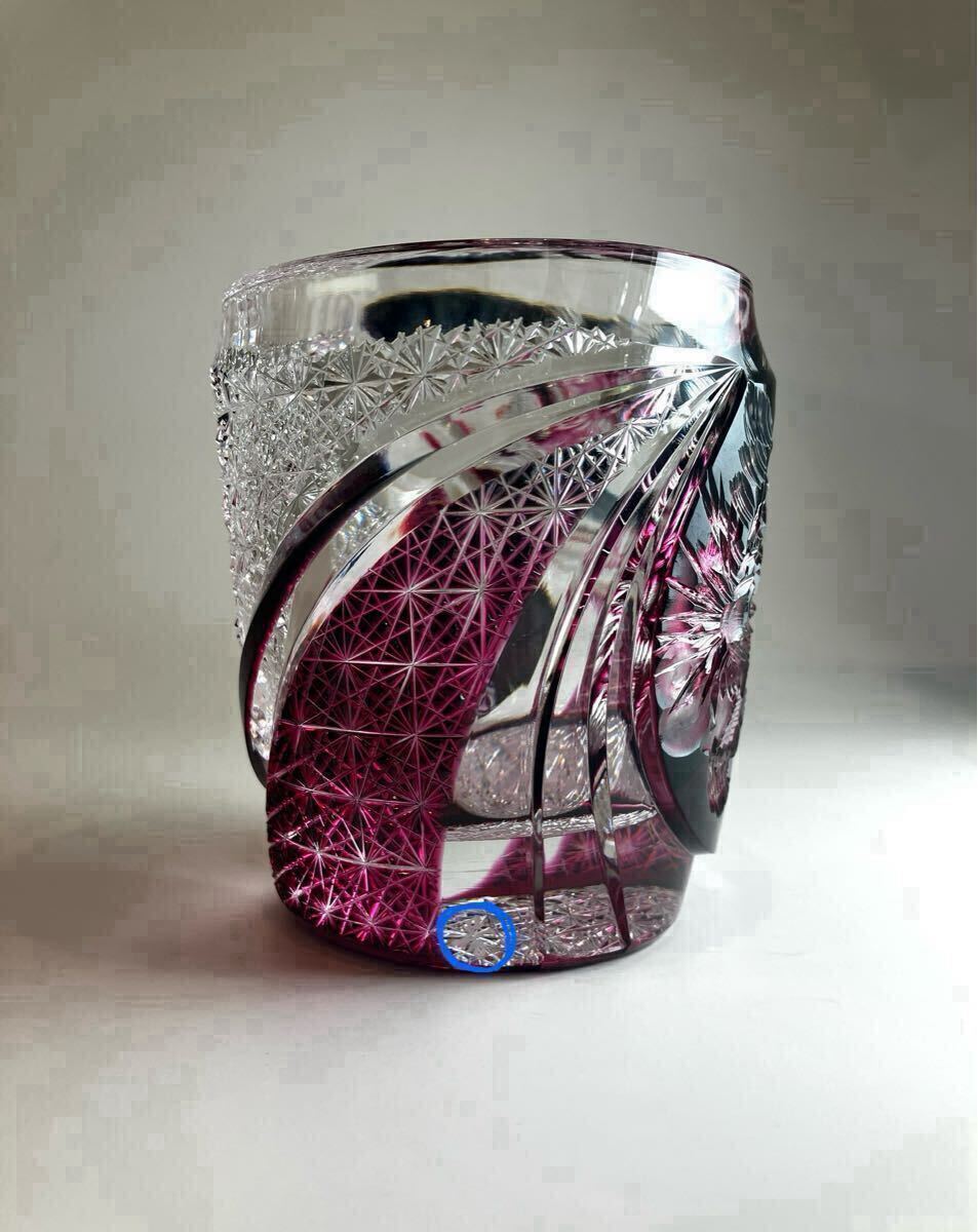 切子の素材は宙吹きで重厚感があり、2色被せでクリアガラスの上に、上部に黒、下部に金赤のガラスを被せた珍しい素材に彫り込まれています。