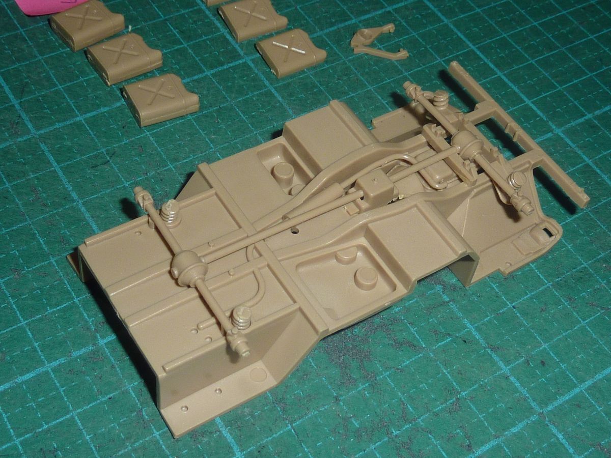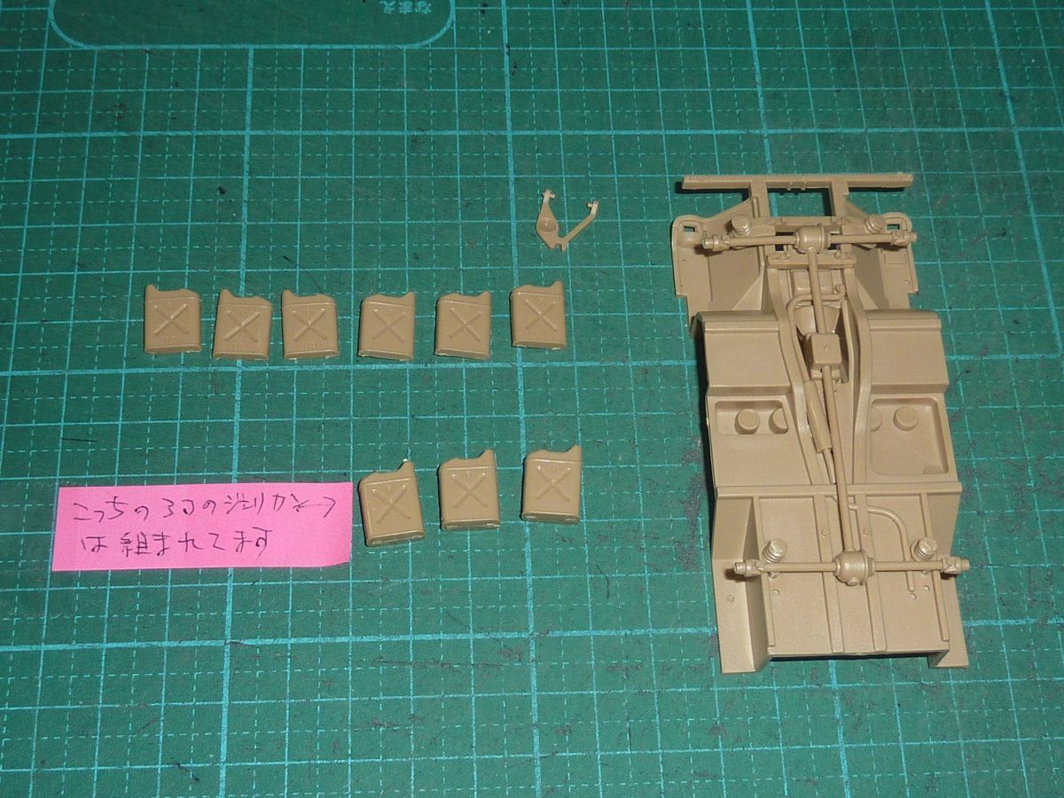 車体シャーシ部分とジェリカンに無塗装で組まれている部分があります。(写真参照)