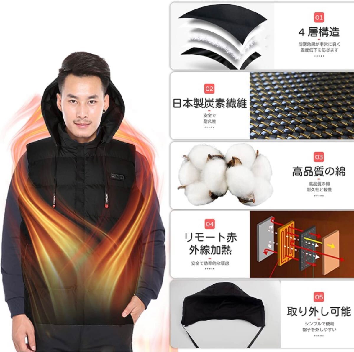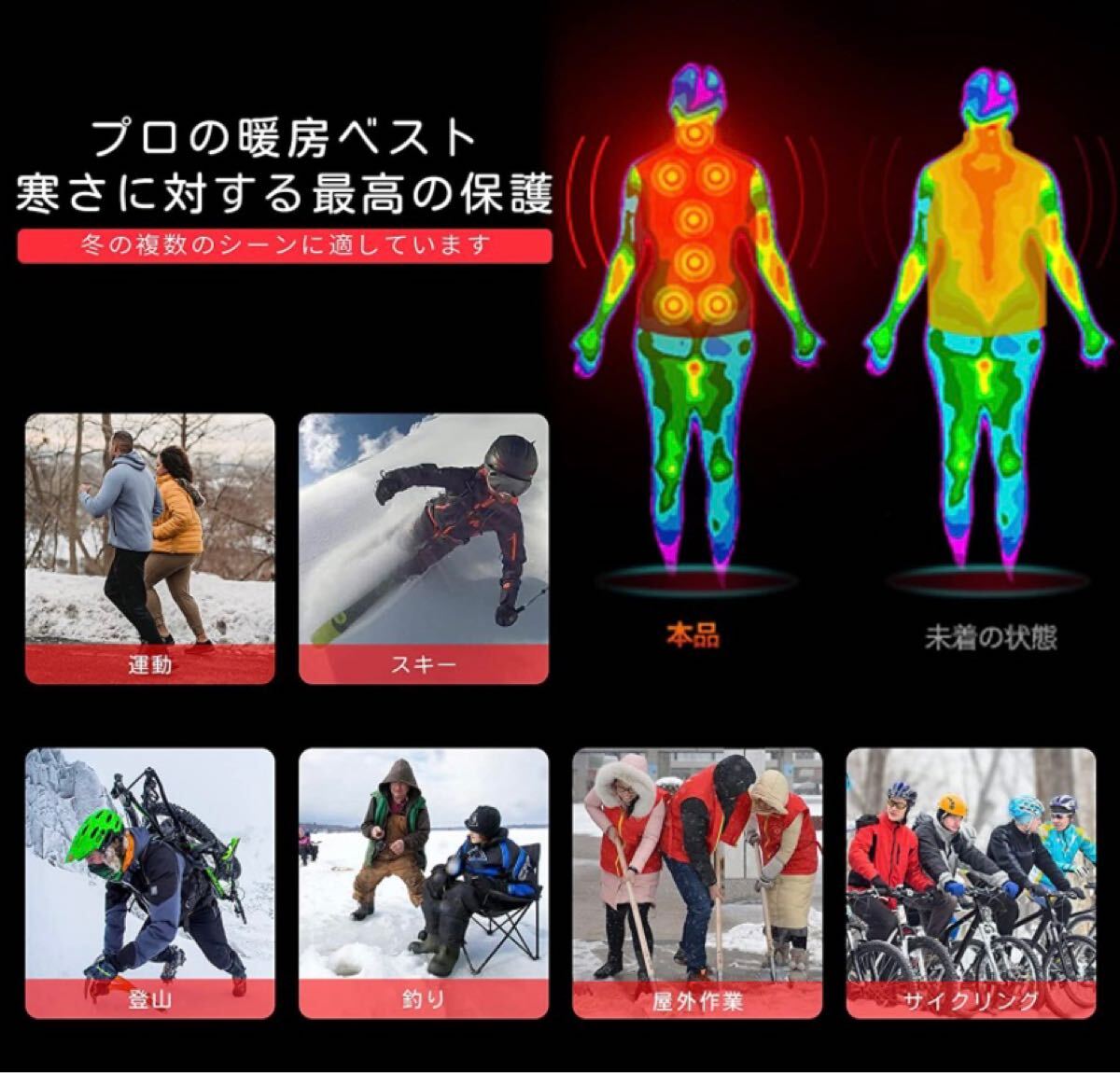 日本製最新な炭素繊維材質と輸入した優れるTPU加熱シート材質を採用しております。前面に2つ、背面に7つの加熱ヒーターが内蔵され、しっかり温めてくれる発熱ベストです。男女兼用で、9箇所を効率よく温まるので、冷えやすい寒い季節として保温できる電熱ベストです。