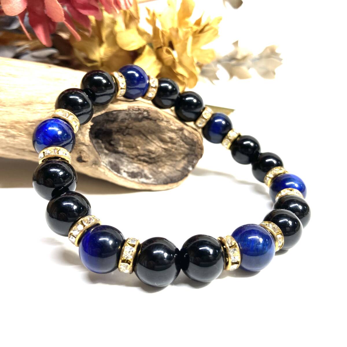 こちらは、モリオンとブルータイガーアイを組み合わせたパワーストーンブレスレットです。間にはロンデルを挟み高級感あるデザインに仕上げております。石大きさは腕にも馴染みやすいように10mm玉で内径約18cm(伸可能)です。(サイズ変更の場合は取引ナビにてご連絡をお願いします。) 数に限りがございますので気になる方はお早めにどうぞ。