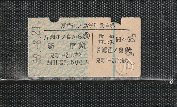 小田急電鉄 新宿・東北沢から片瀬江ノ島 A型 緑地紋 夏季江ノ島割引 往復 硬券乗車券 上パンチ券