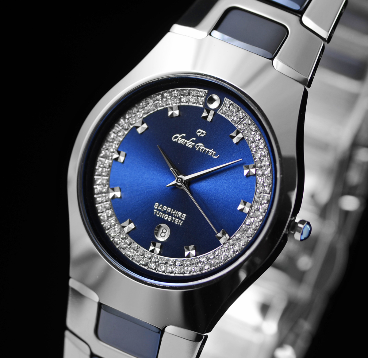 今回の品は、ケースにタングステン、ベルトのカラー部分にセラミックを採用し、風防にはサファイヤクリスタル、文字盤にCZダイヤを散りばめた豪華なスタイリッシュウォッチ。