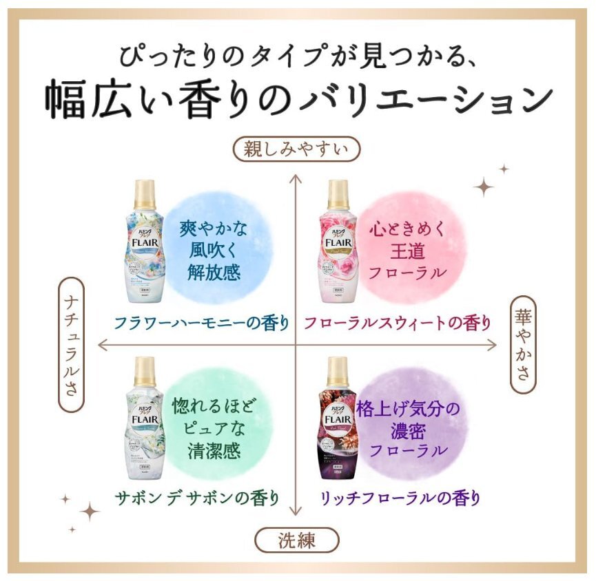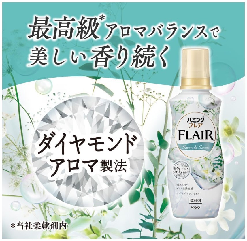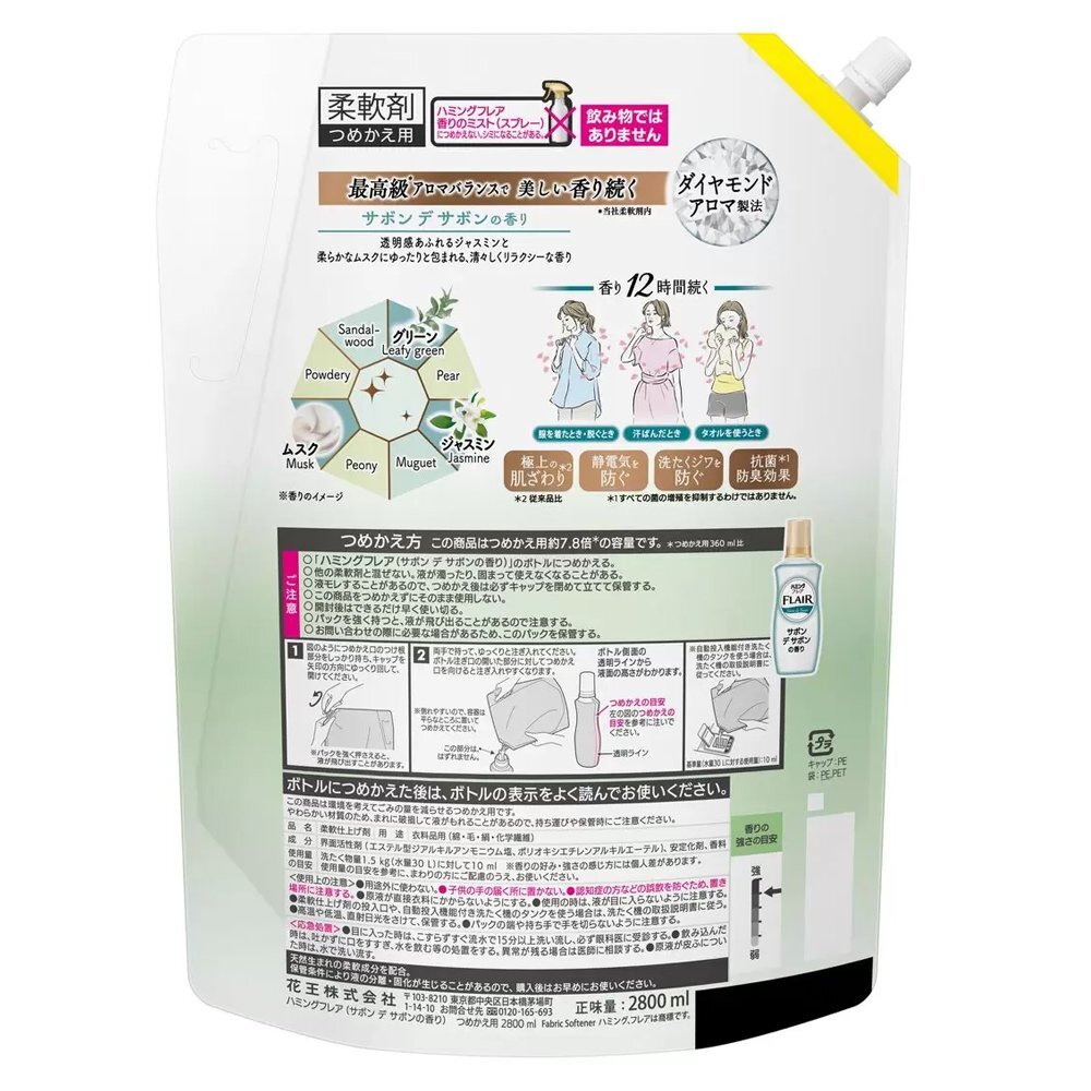 | 商品の説明 | 最高級*1アロマバランスで美しい香り続く、ダイヤモンドアロマ製法。 透明感あふれるジャスミンと柔らかなムスクにゆったりと包まれる、清々しくリラクシーなサボン デ サボンの香り。 ・香り12時間続く(服を着たとき・脱ぐとき、汗ばんだとき、タオルを使うとき) ・極上の肌ざわり*2 ・静電気を防ぐ ・洗たくジワを防ぐ ・抗菌*3 ・防臭効果 *1当社柔軟剤内 *2従来品比 *3すべての菌の増殖を抑制するわけではありません |