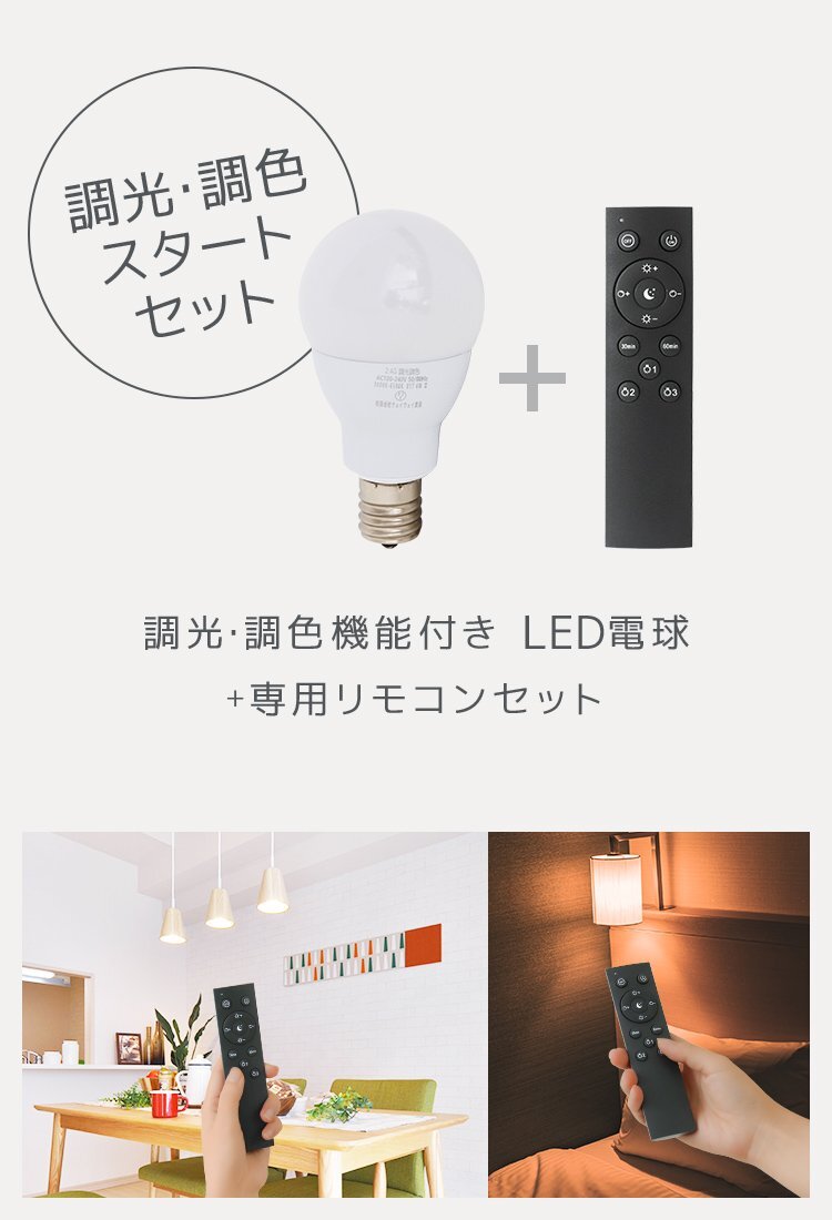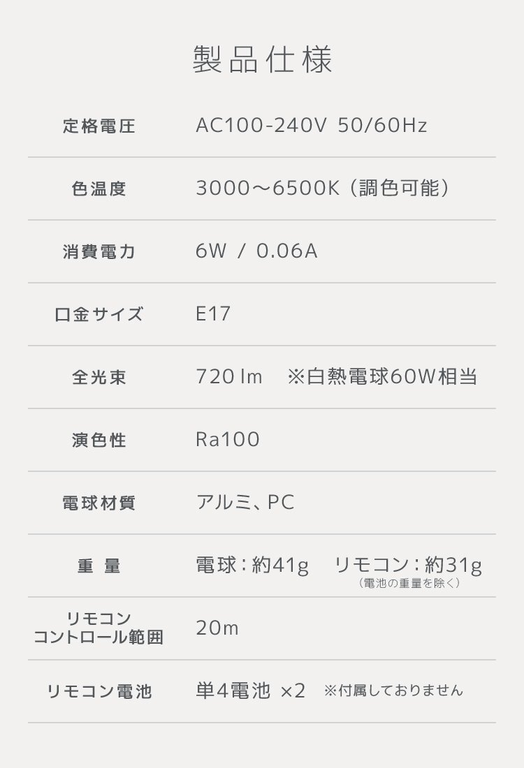 調光リモコン対応LED電球 広配光タイプ 720ルーメン 消費電力6W 明るさや色温度が自由自在に変えられる! 生活シーンやその日の気分に合わせて思いのままに 灯りをコントロールできる!! 【配色種類】 ・電球色 温かみのある光。リラックスしたい空間にピッタリ ・昼白色 太陽に近い自然な光。メイクするときや服を選ぶときに ・昼光色 さわやかでスッキリした光。文字がくっきり読みやすい 鮮やかな色味が特徴の電球です 高い演色性で物の色や肌の色がより美しく自然に見えます 当商品は専用のリモコンの購入が必要となります。 →リモコンのみ販売ページはこちら← 【商品仕様】 内容: LED電球6個+専用リモコン 機能:無段階調色/無段階調光/広配光タイプ 金口サイズ:E17 サイズ:(約)幅4.5×長さ8.5cm 定格電圧:AC100-240V 50/60Hz 色温度:電球色/昼白色/昼光色 重量:(約)41g 【注意事項】 ・調光・調色LED電球は当店で販売している指定の調光リモコン以外ではご使用いただくことはできません。 ・調光機能及びセンサー機能付きの電源、照明器具でご使用いただくことはできません ・玄関照明などの密閉型の器具にも使用できますが長時間使用する場合、電球寿命が短くなる場合があります。 ・取付・取外しや清掃の際は必ず電源を切って作業してください。 ・点灯中のランプを長時間見つめないでください。 ・商品は、モニターによって色合いが異なって見える場合があります。 ・仕様・デザインは改良のため予告なく変更することがあります。 |