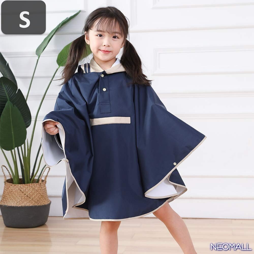 【637】子供用 可愛い レインポンチョ ネイビー Sサイズ 身長 75cm - 90cm 防水 撥水 雨具 雨 雪 ゲリラ豪雨 通園 通学 お出かけ